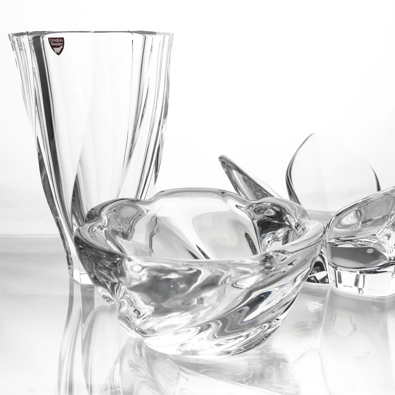 Bowl, “Lotus” Lars Hellsten, height: 10,5 cm Vase, “Residence”, Olle Alberius, height: 21 cm Bowl, “Stella Polaris”, Vicke Lindstrand, height: 8,5 cm.