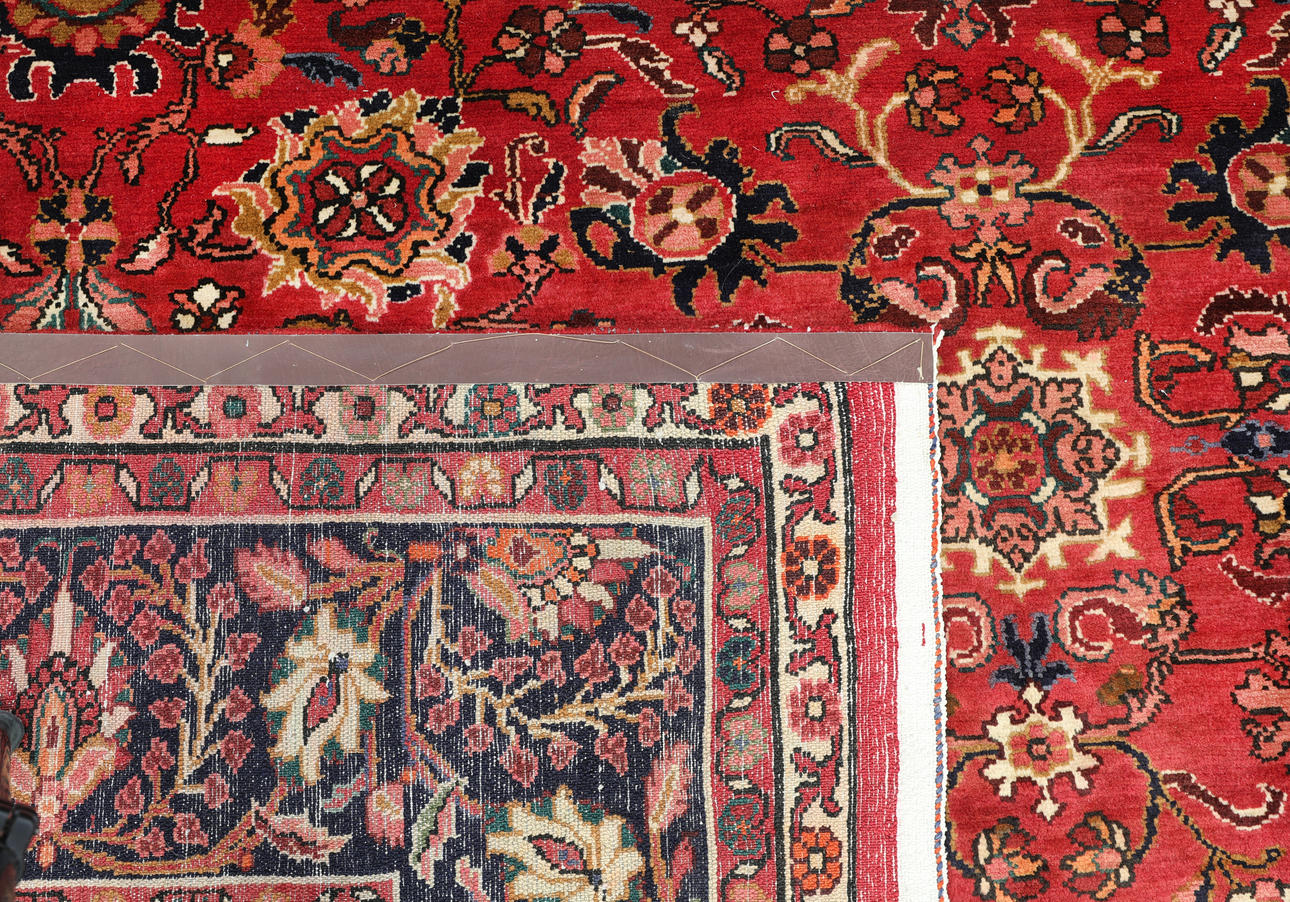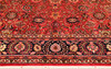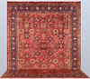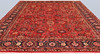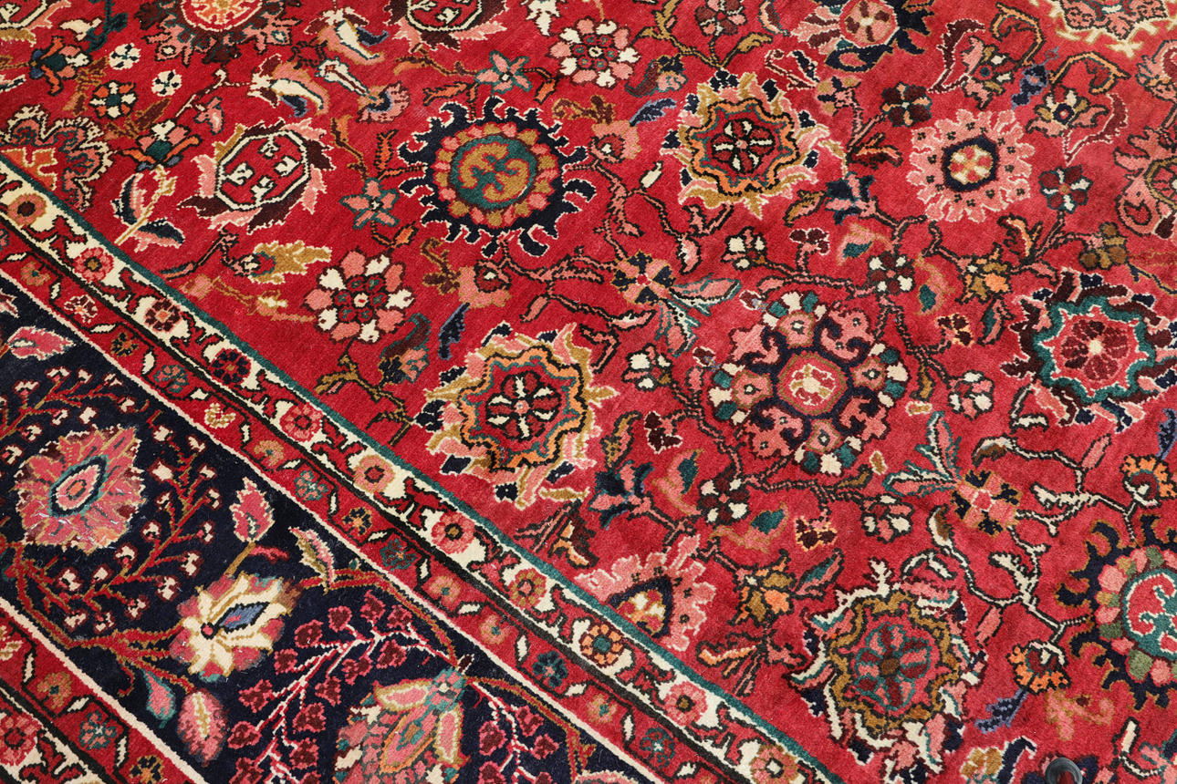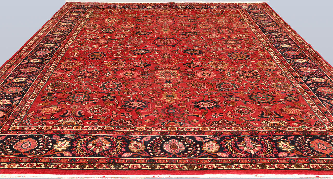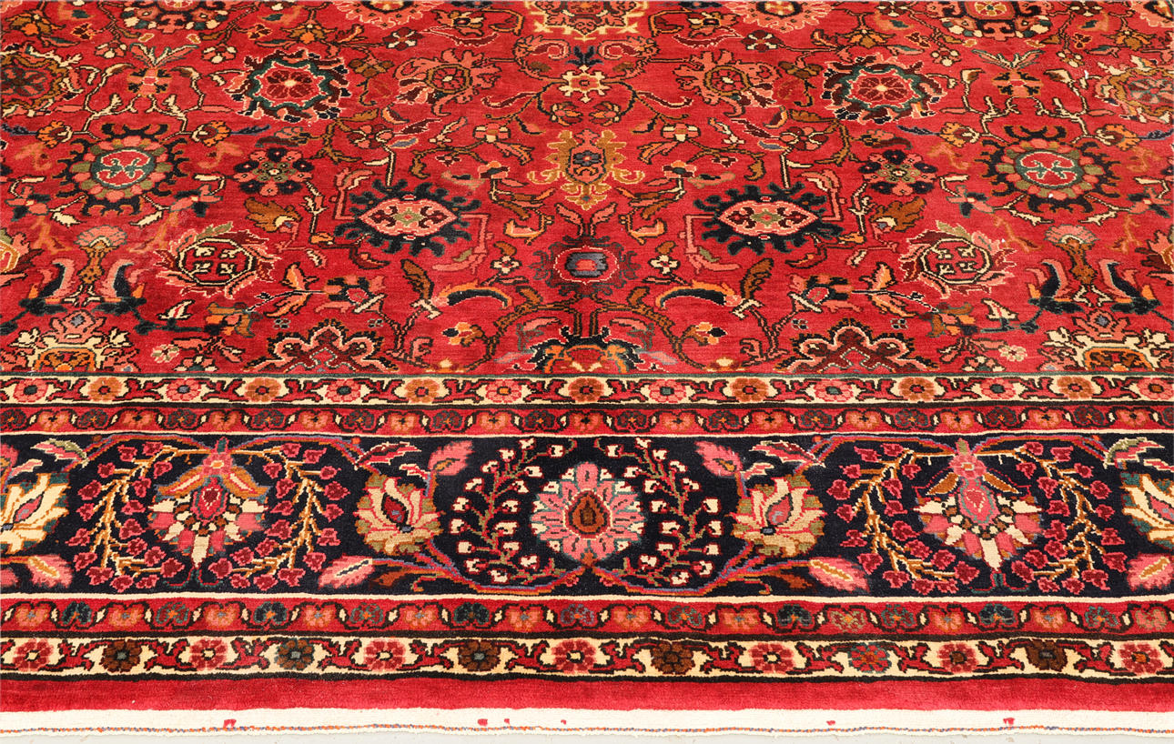 Naradje with a red bottom and a center field decorated with palmettes and stylized flowers in beige, blue and green. The border has a dark base color and is richly decorated with additional floral and vine motifs. The bangs are made of wool and the warp is made of cotton.