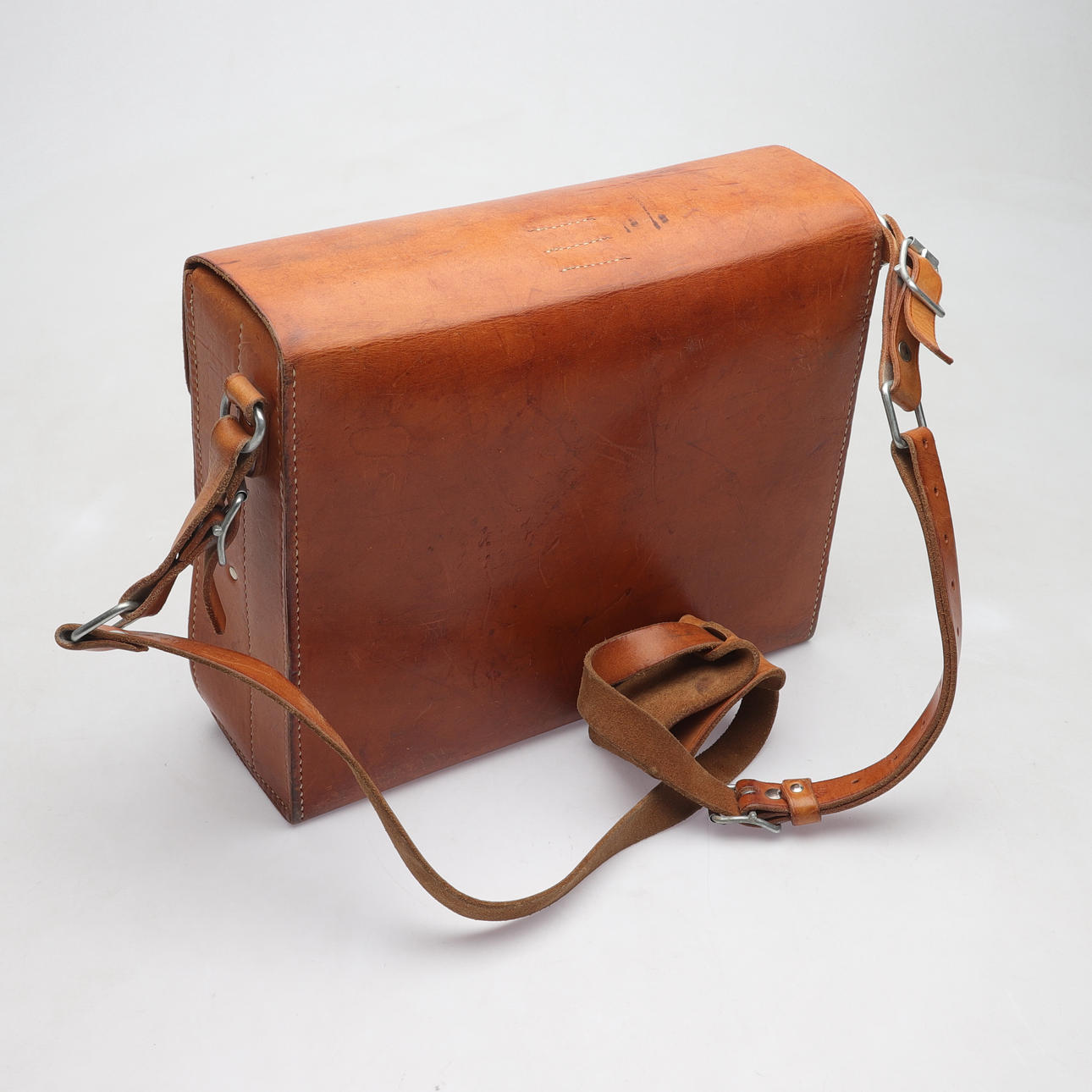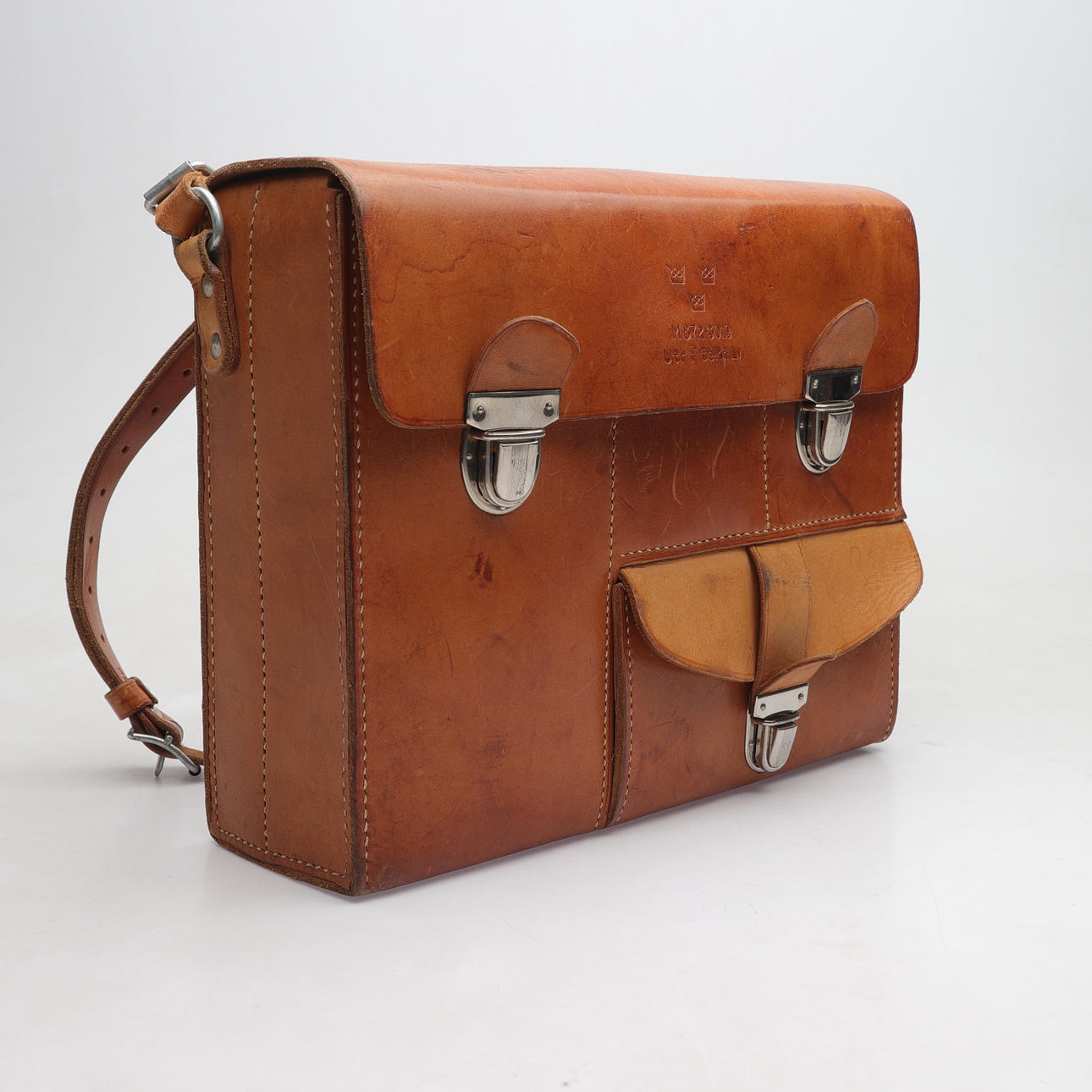 Laptop with various accessories. Leather shoulder bag marked “M872-3019 Utr f tekn Lv”. Bag size approx. 30x35x11 cm.