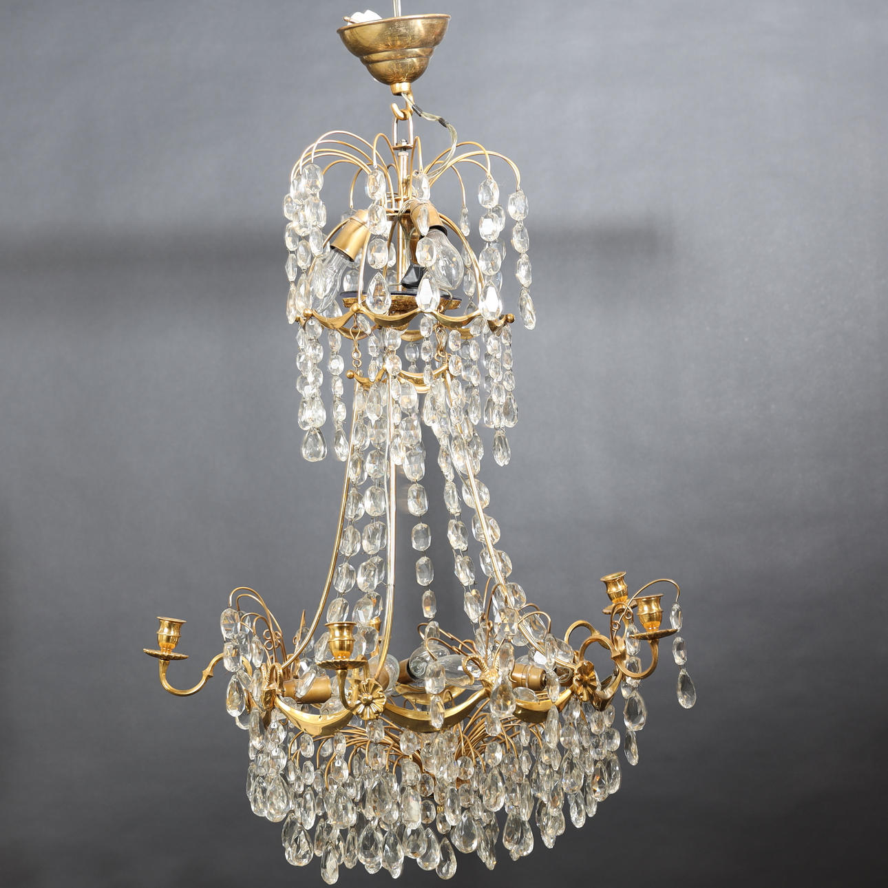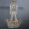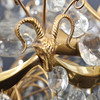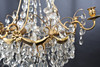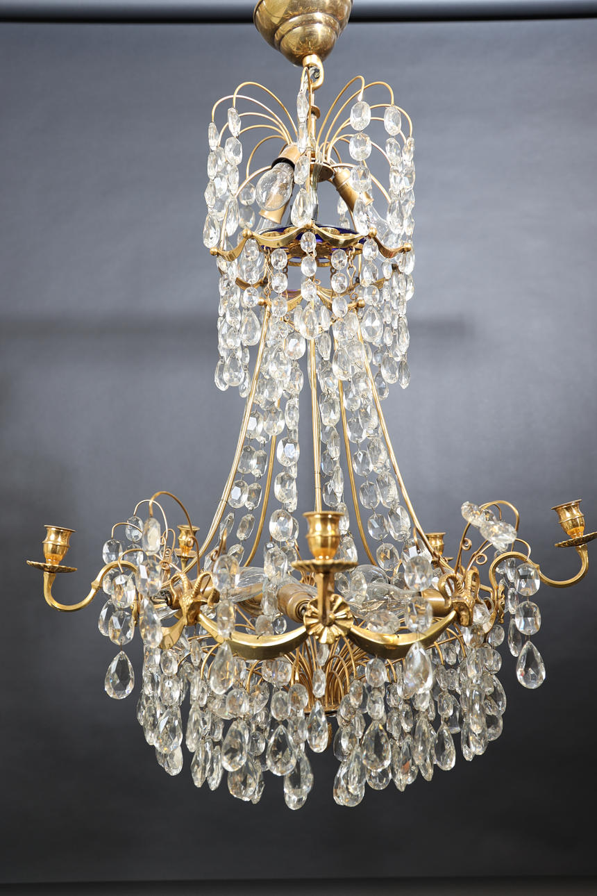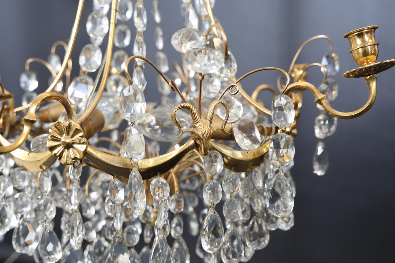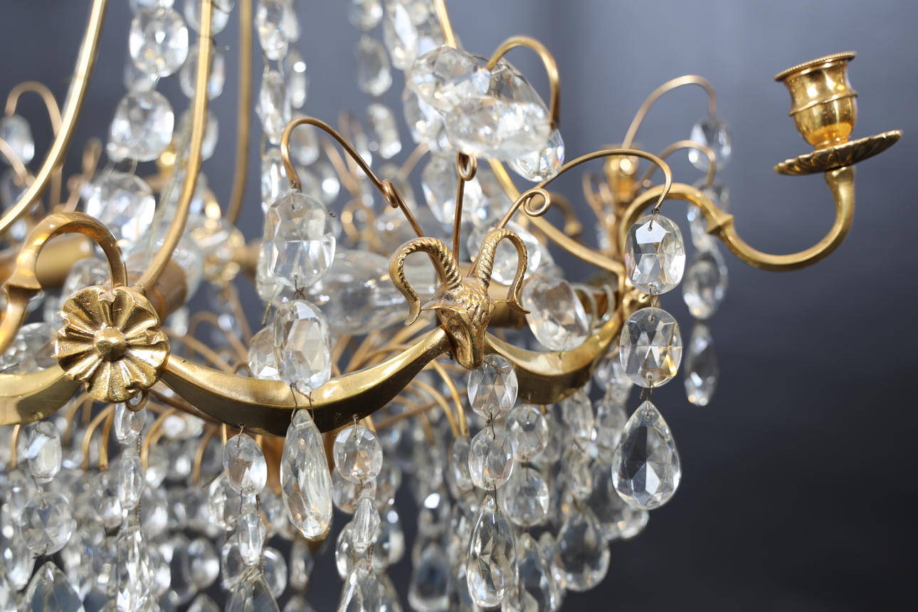 Frame made of brass, decorations of buck heads and flowers. Hinged with sanded prisms. For five candles, eight light points. Height 70cm.