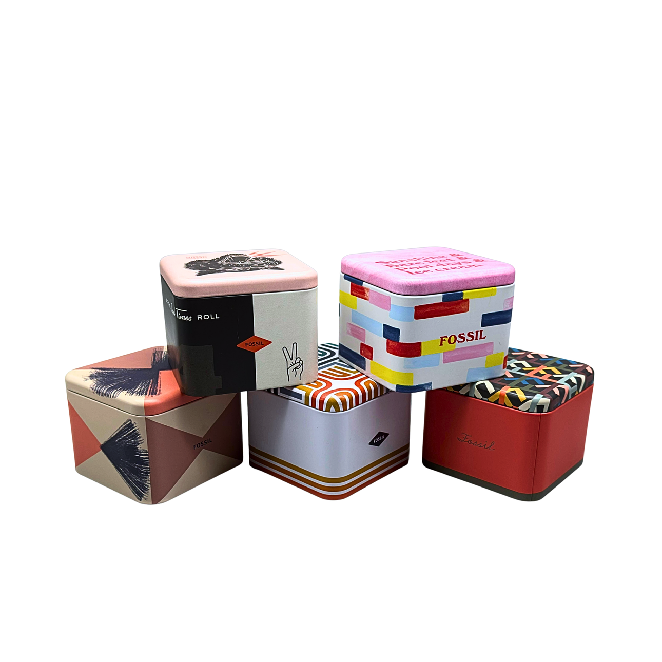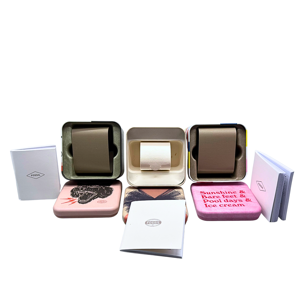 Five different metal boxes from Fossil. Three watch boxes and two jewelry boxes, each with a cloth bag and an information booklet. Year of construction from 2014 to 2022.