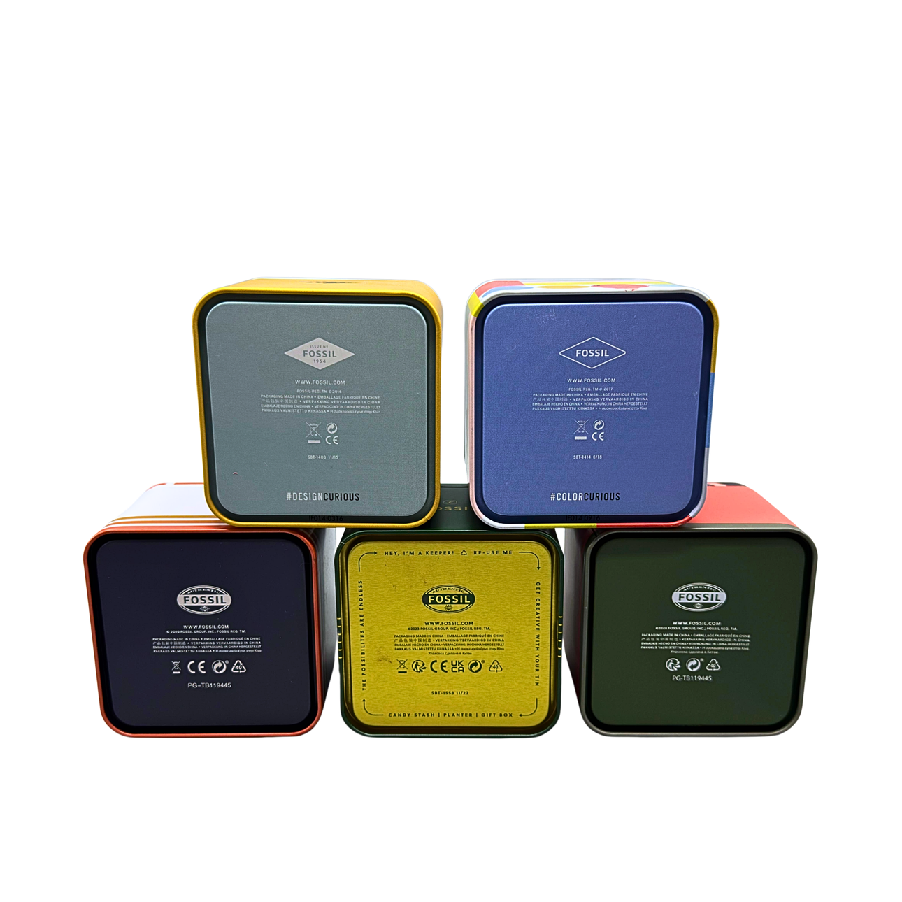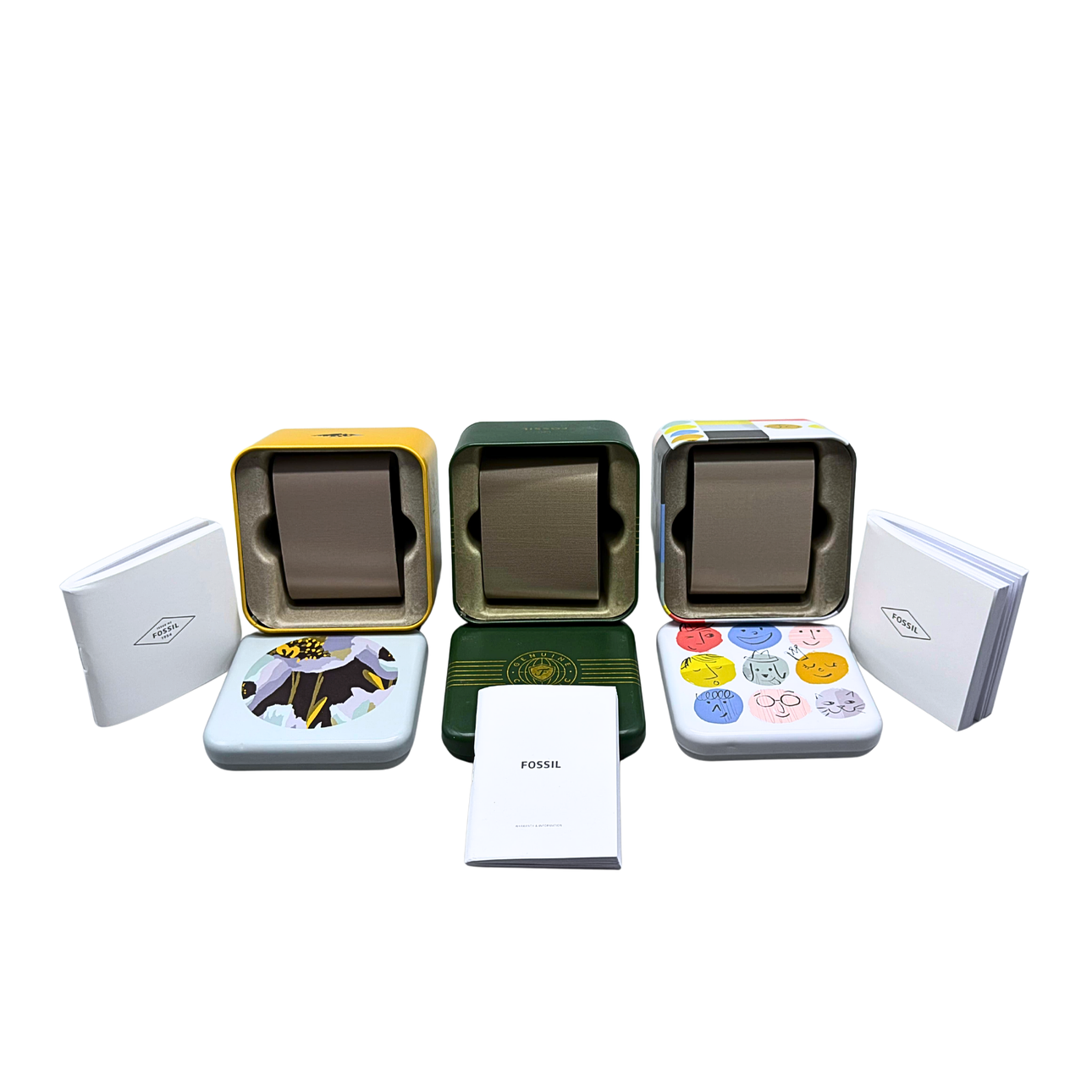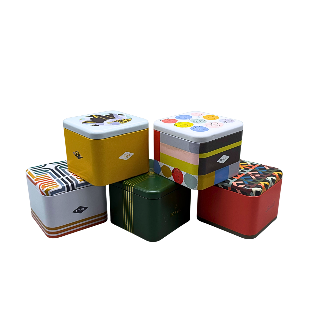 Five different metal boxes from Fossil. Three watch boxes and two jewelry boxes, each with a cloth bag and an information booklet. Year of construction from 2016 to 2020.