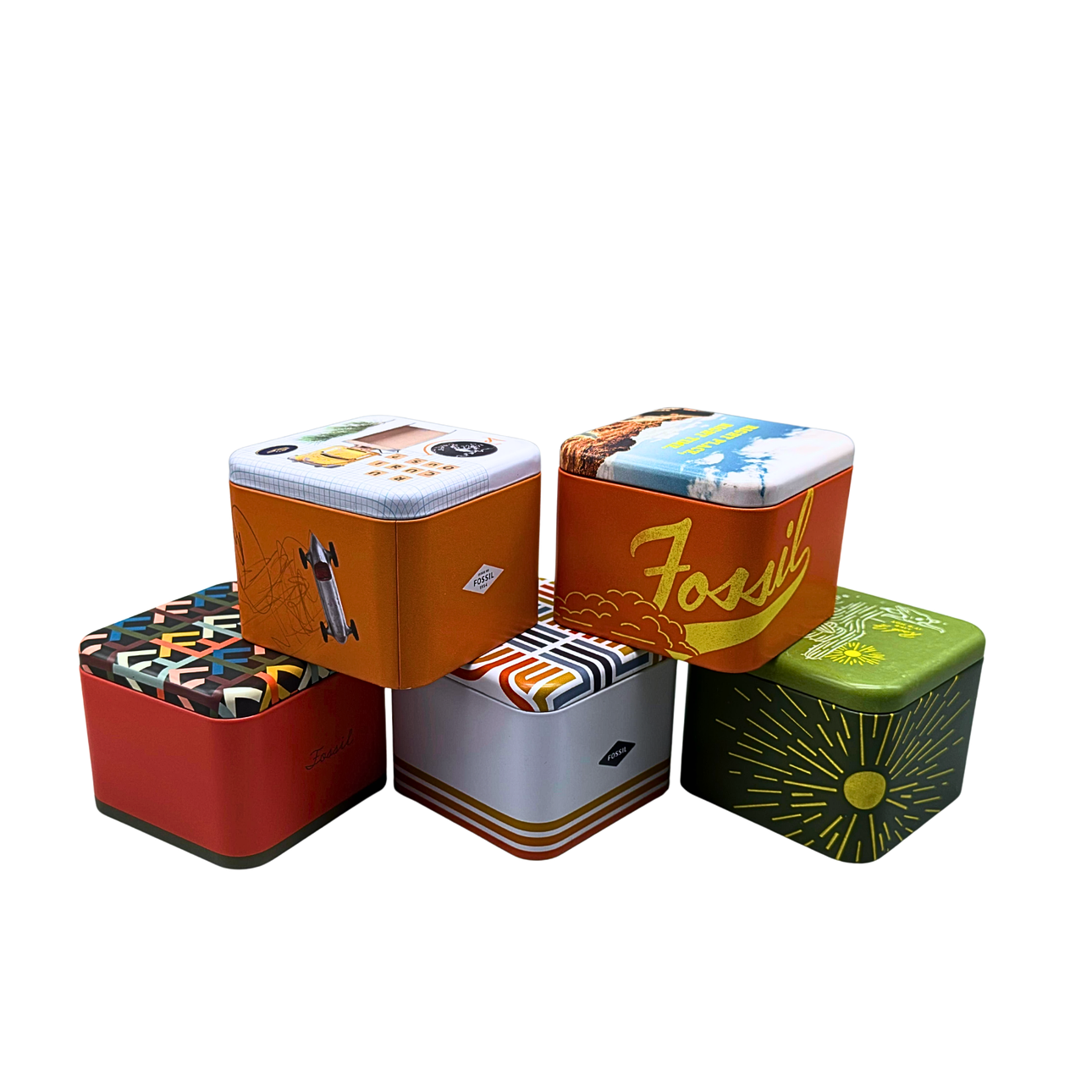 Five different metal boxes from Fossil. Three watch boxes and two jewelry boxes, each with a cloth bag and an information booklet. Year of construction from 2016 to 2023.