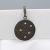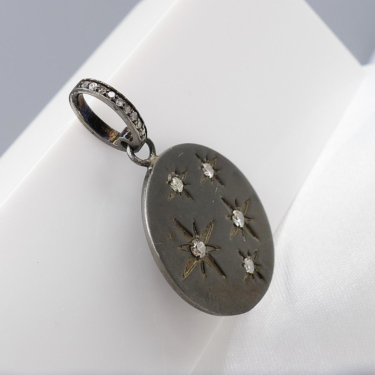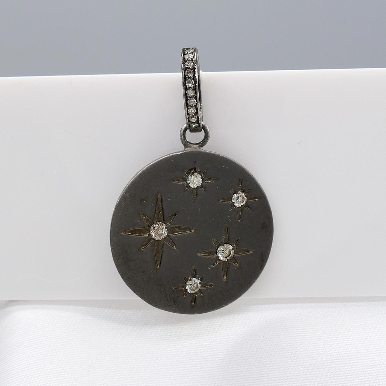 A silver disc pendant constellation-set with 5 diamonds, with further diamonds to the loop