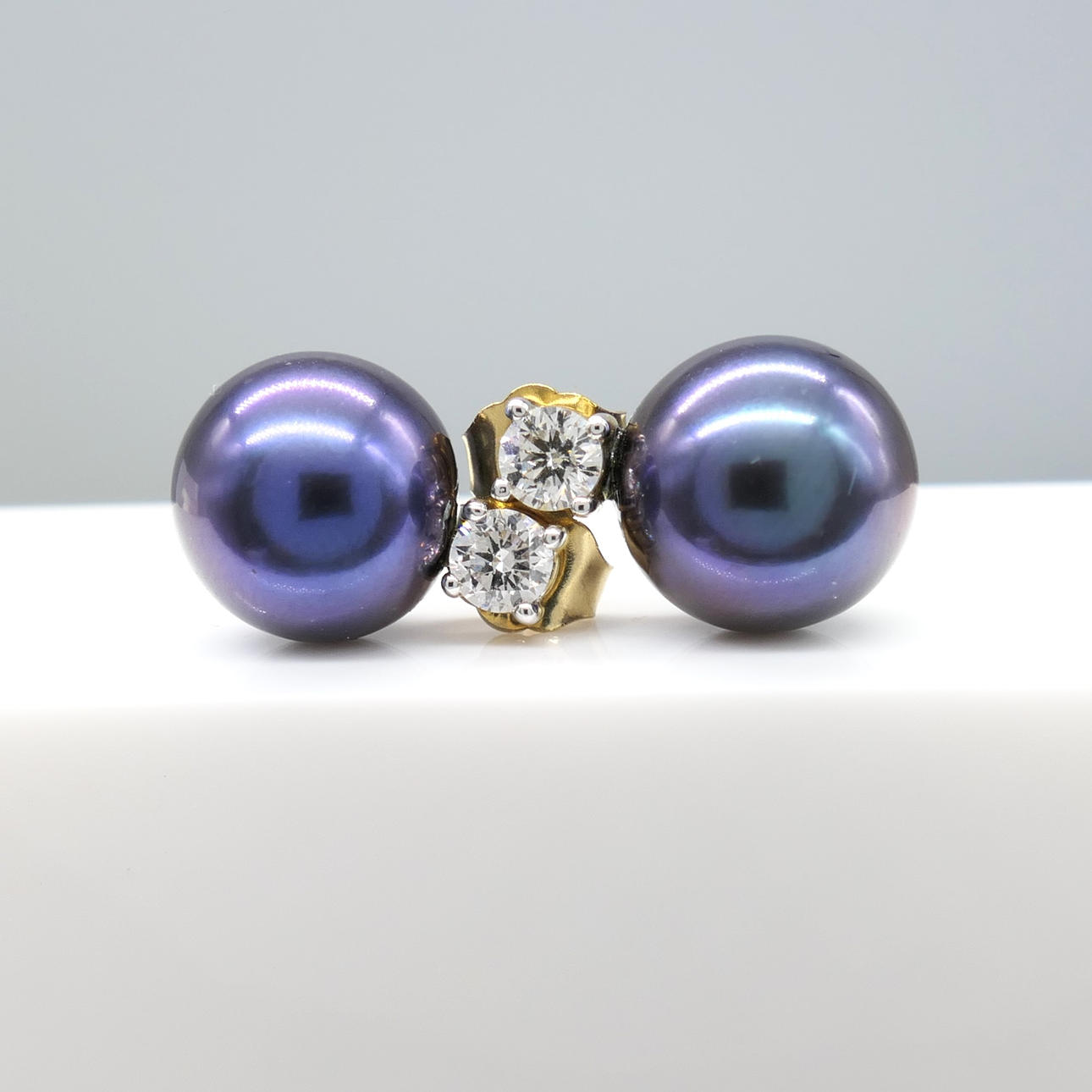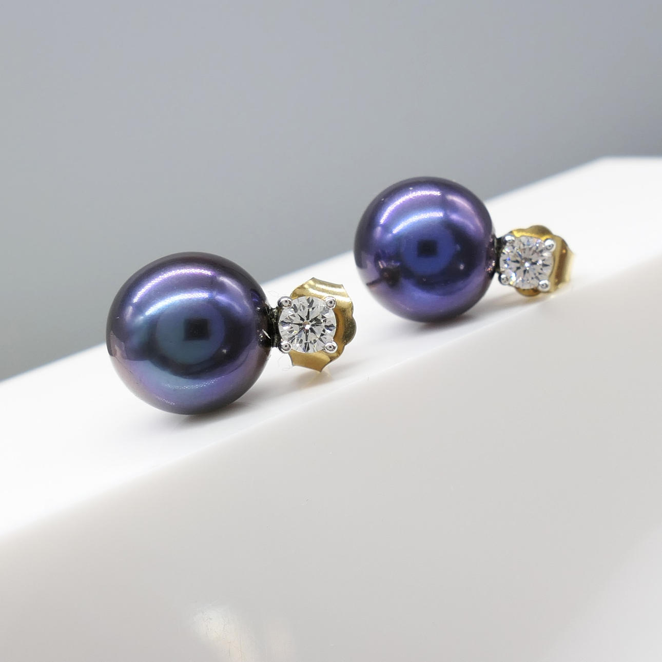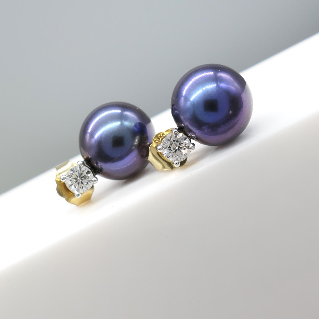 A pair of yellow gold stud earrings set with dark iridescent pearls and diamonds, with gift box