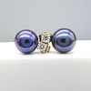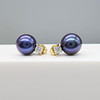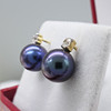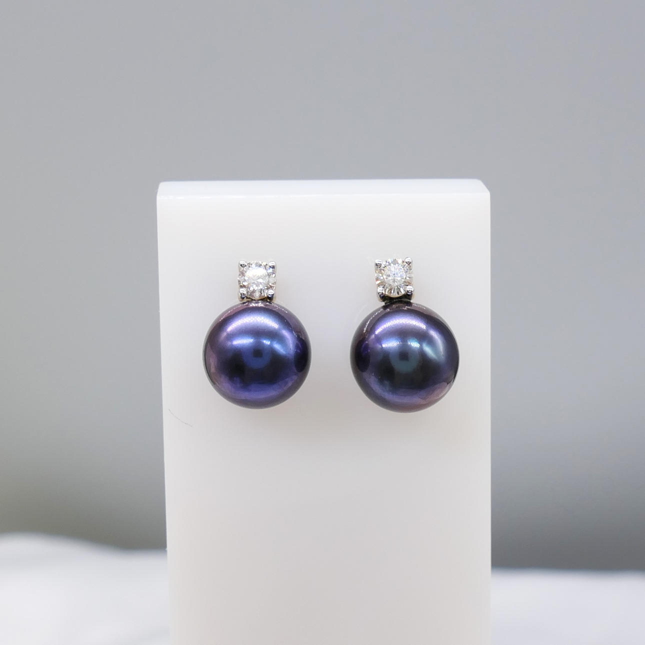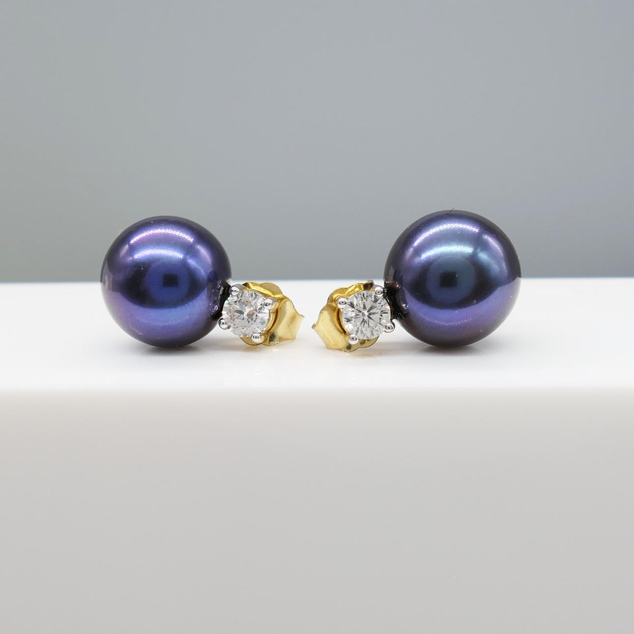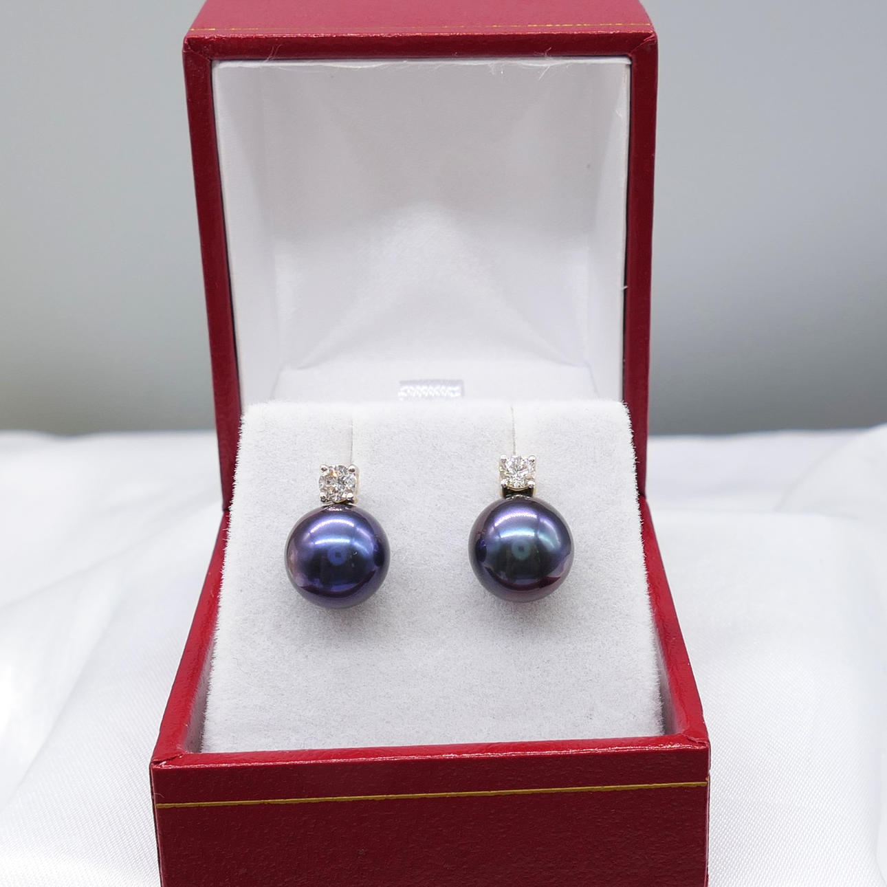 A pair of yellow gold stud earrings set with dark iridescent pearls and diamonds, with gift box