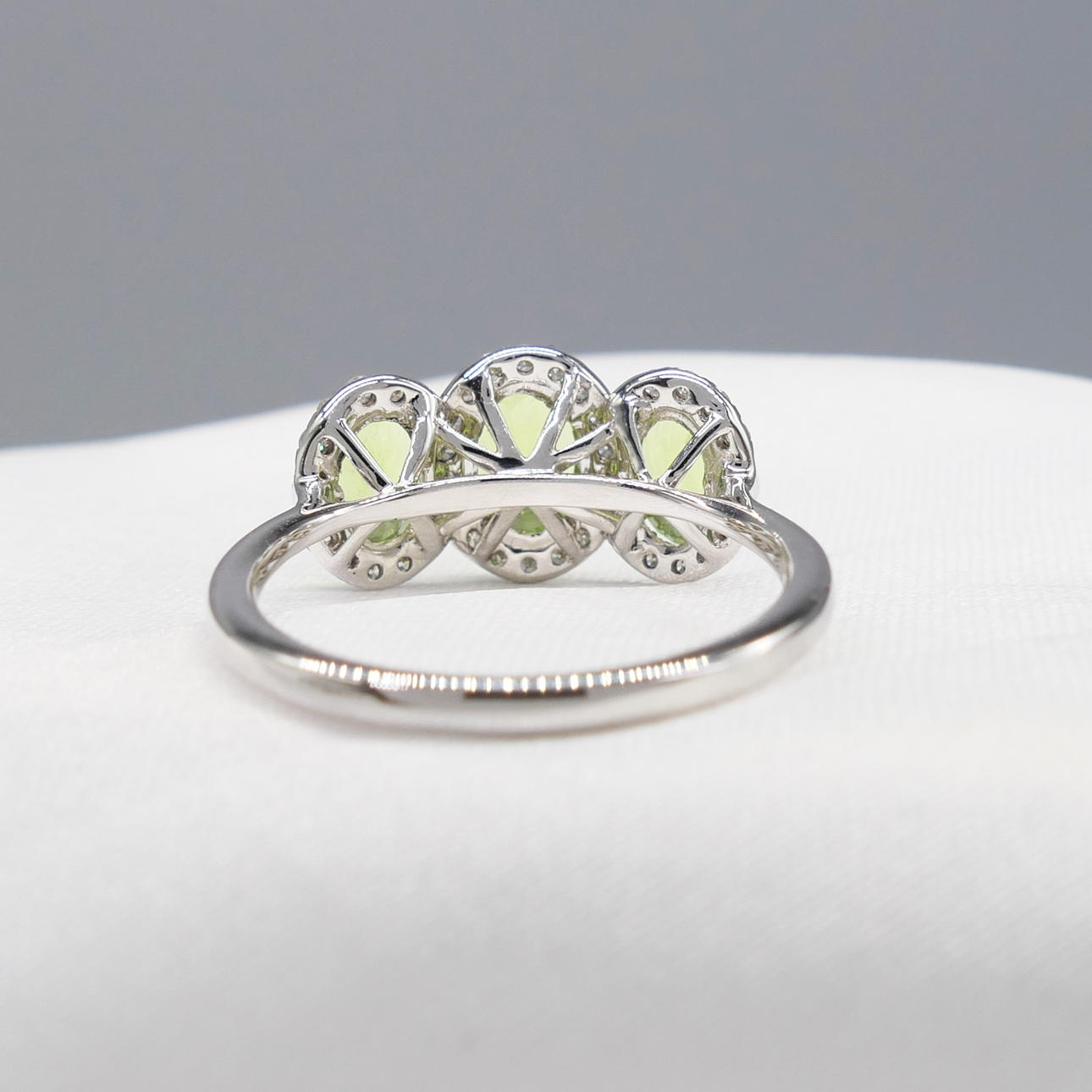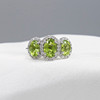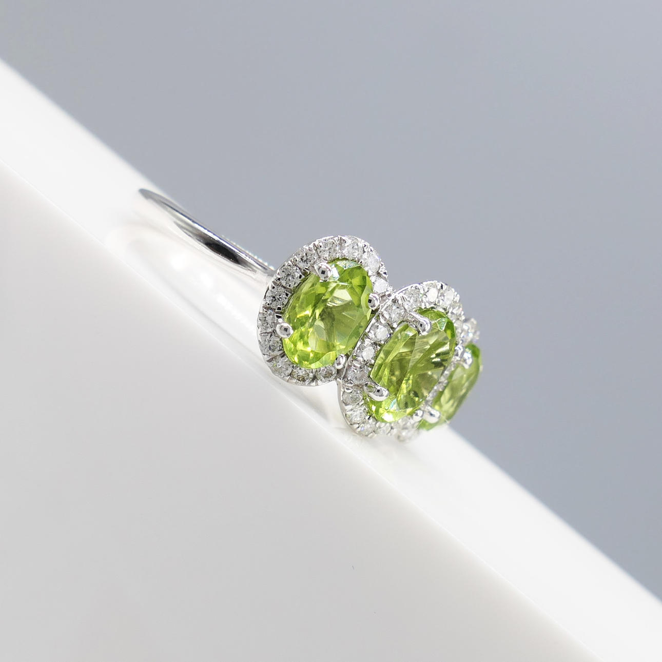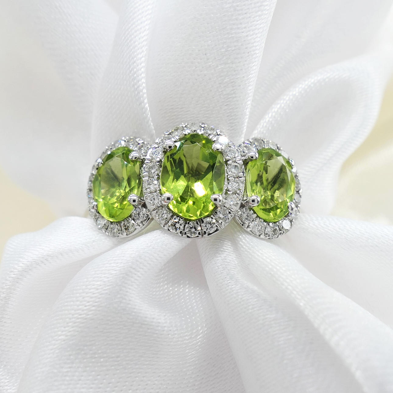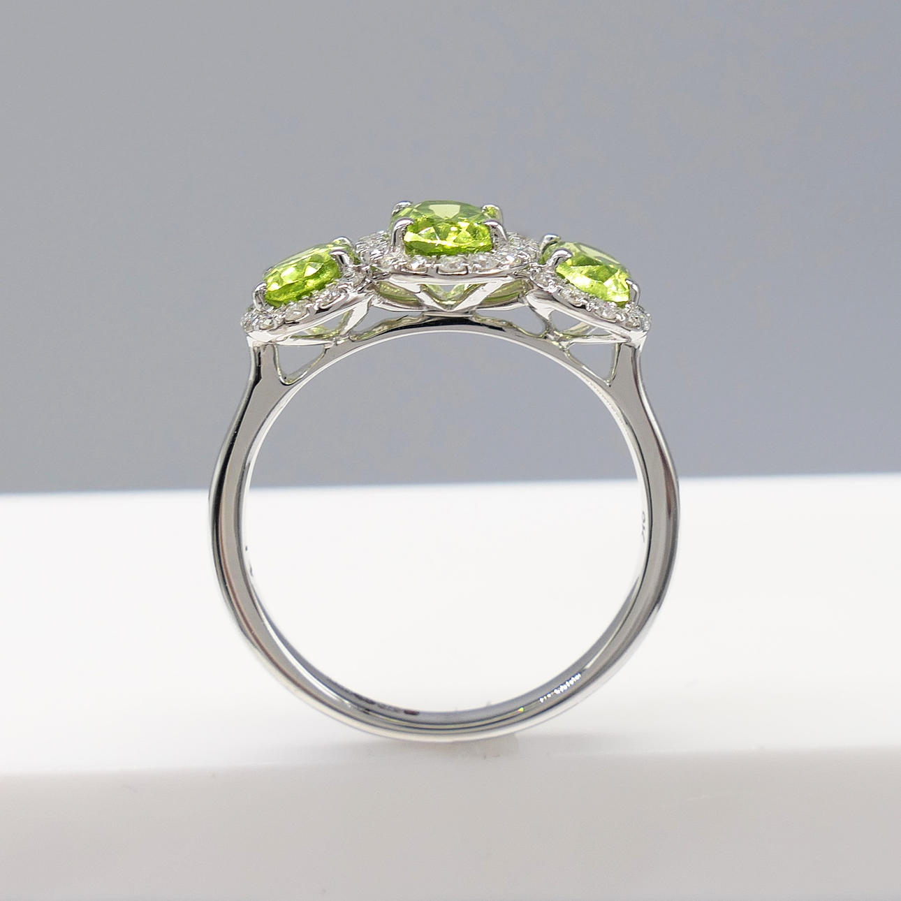 A white gold trilogy style ring set with 3 peridots, each surrounded by diamonds