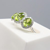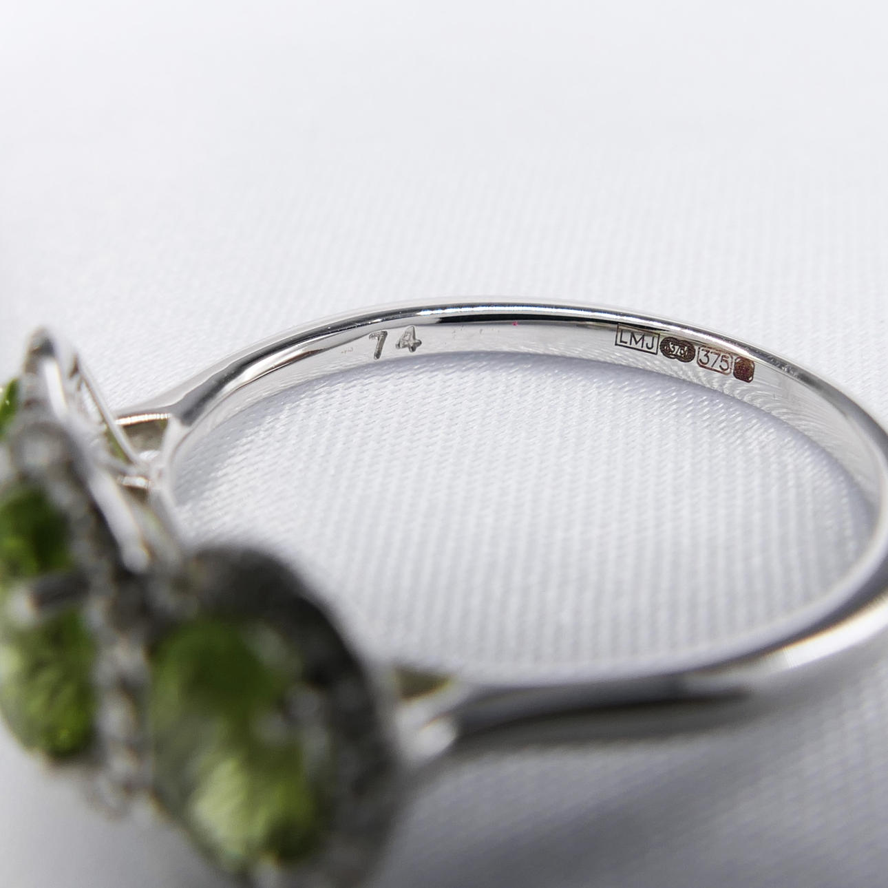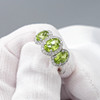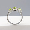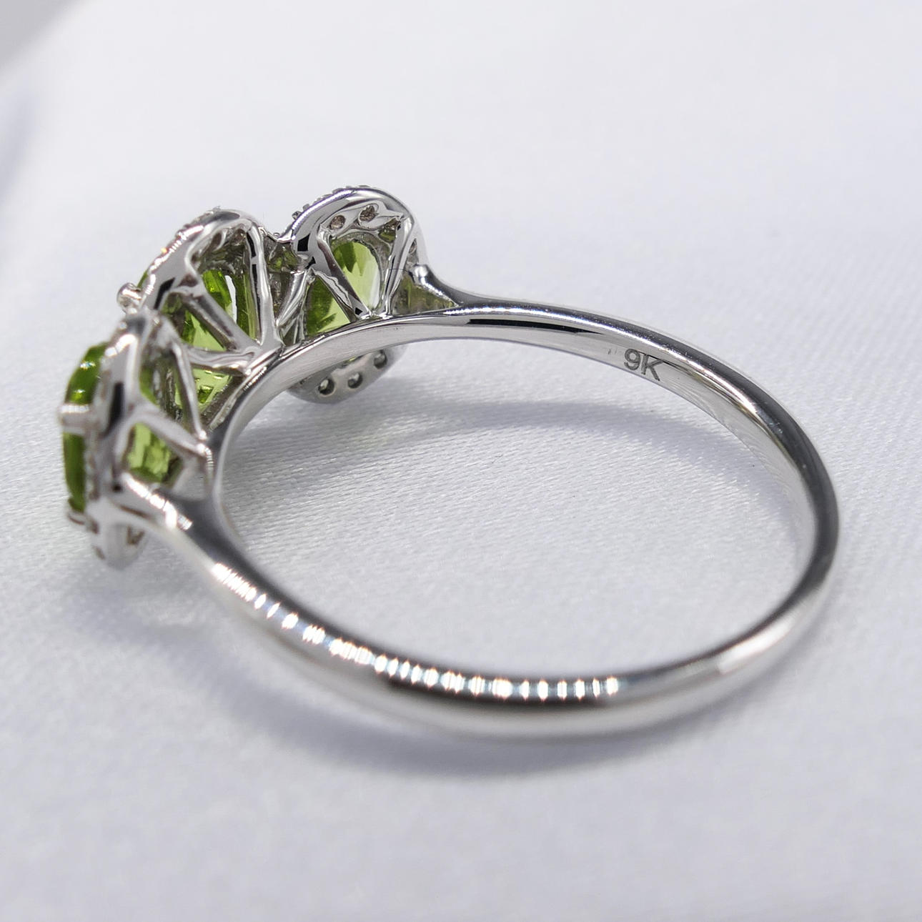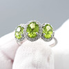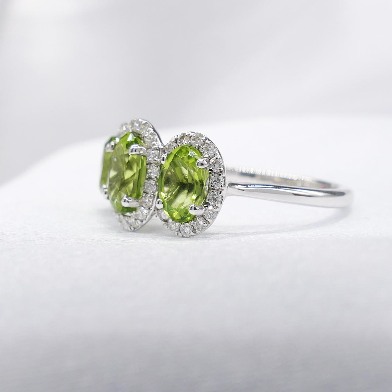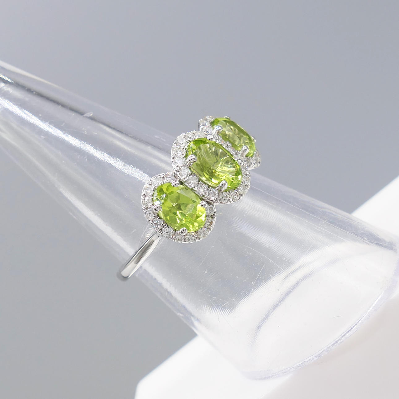 A white gold trilogy style ring set with 3 peridots, each surrounded by diamonds
