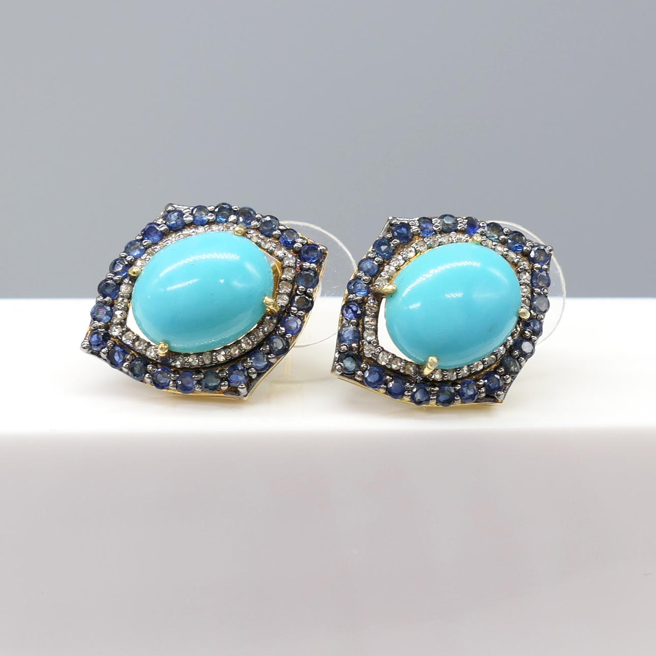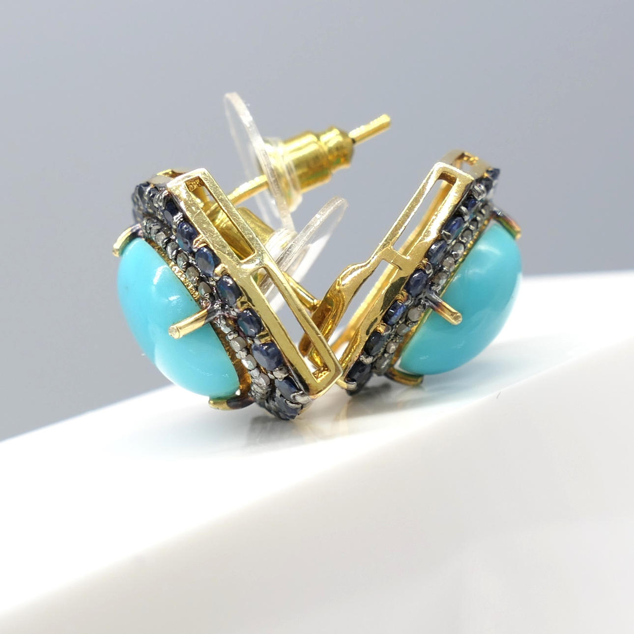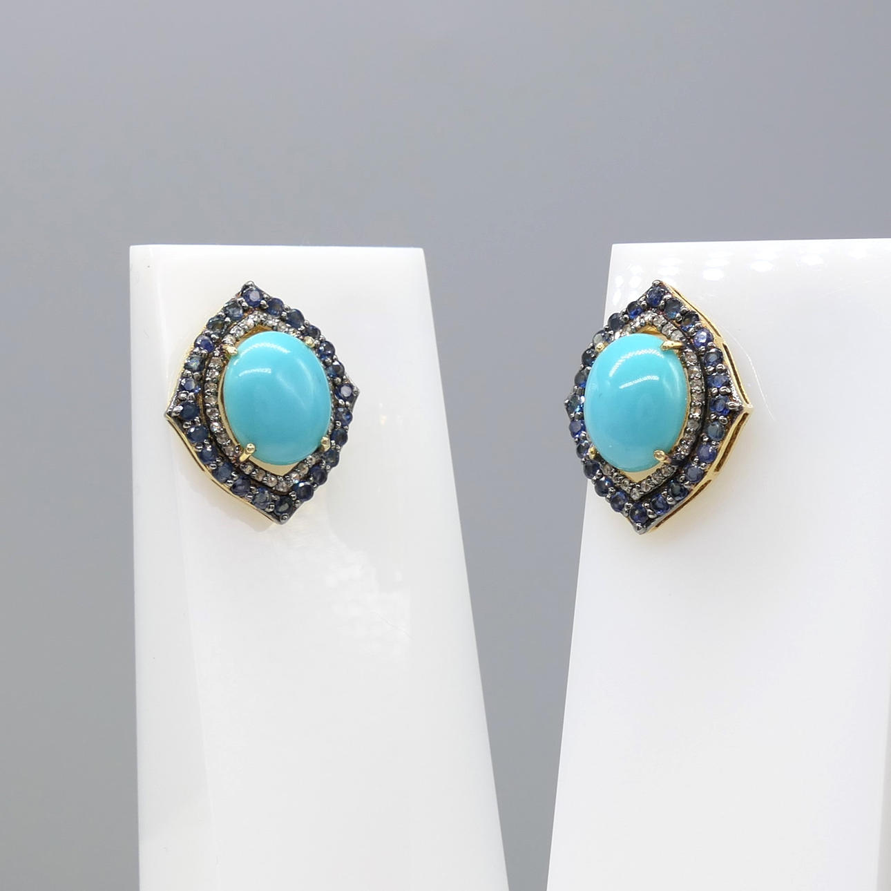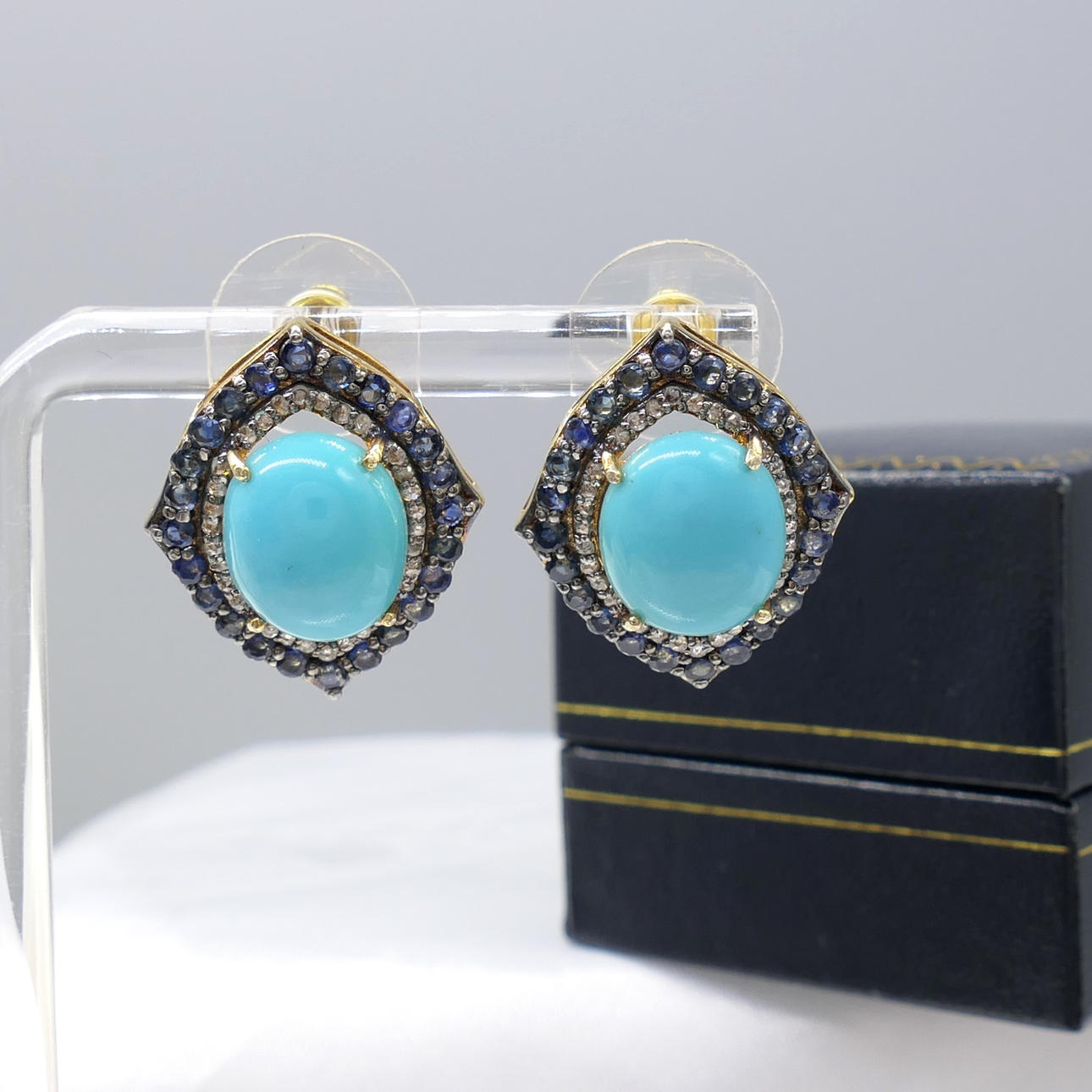 A pair of silver gilt vintage styled ear studs set with cabochon turquoise, with sapphire and diamonds, boxed