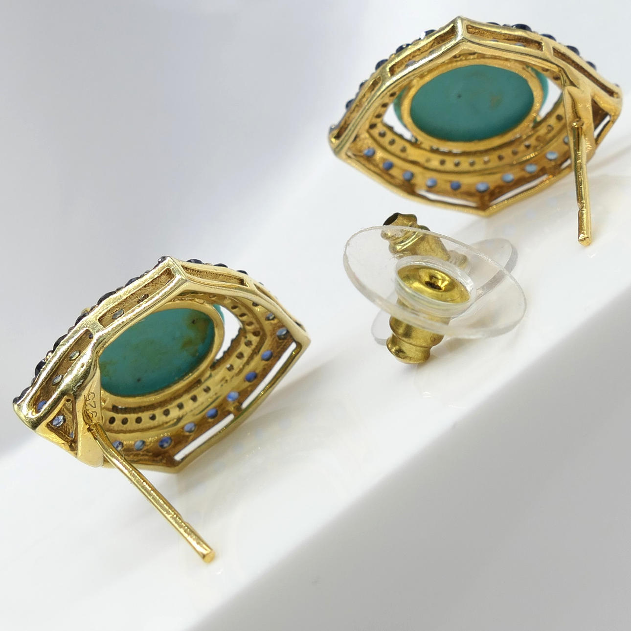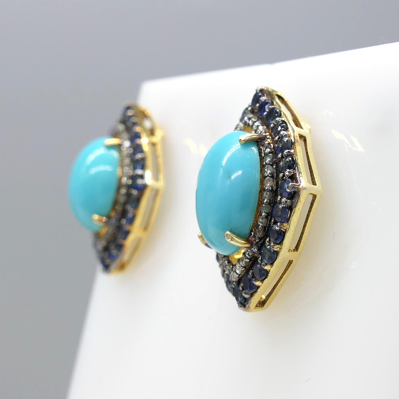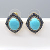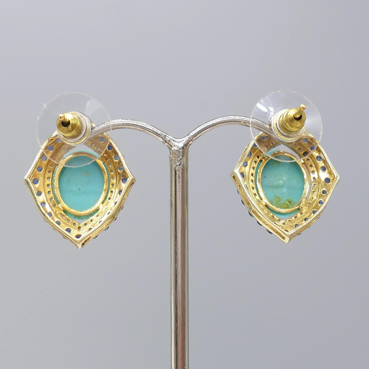 A pair of silver gilt vintage styled ear studs set with cabochon turquoise, with sapphire and diamonds, boxed