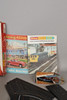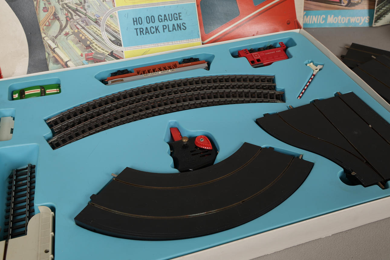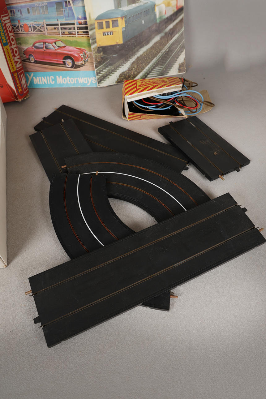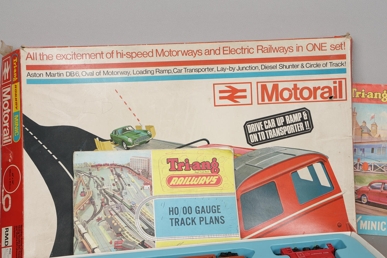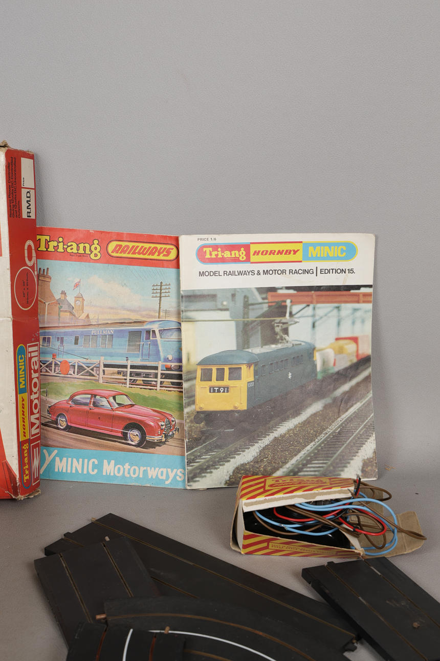 The OO/HO RMD Motorail set by Tri-ang Hornby Minic, including Aston Martin DB6, tracks, motorway track, car transporter, diesel transporter, etc., box measures 56cm x 36cm x 6cm, together with spare motorway track, Tri-Ang power Unit, and manuals/ brochures.