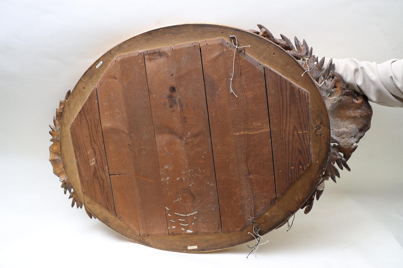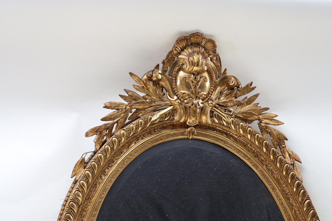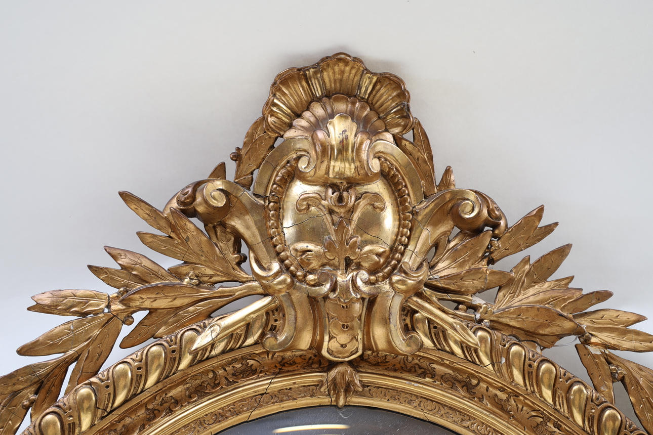 Bronzed and gilded. Decorated with bay leaves and mussel formation. Decorate in pastel lacquer. Partially openwork crest. Labeled.