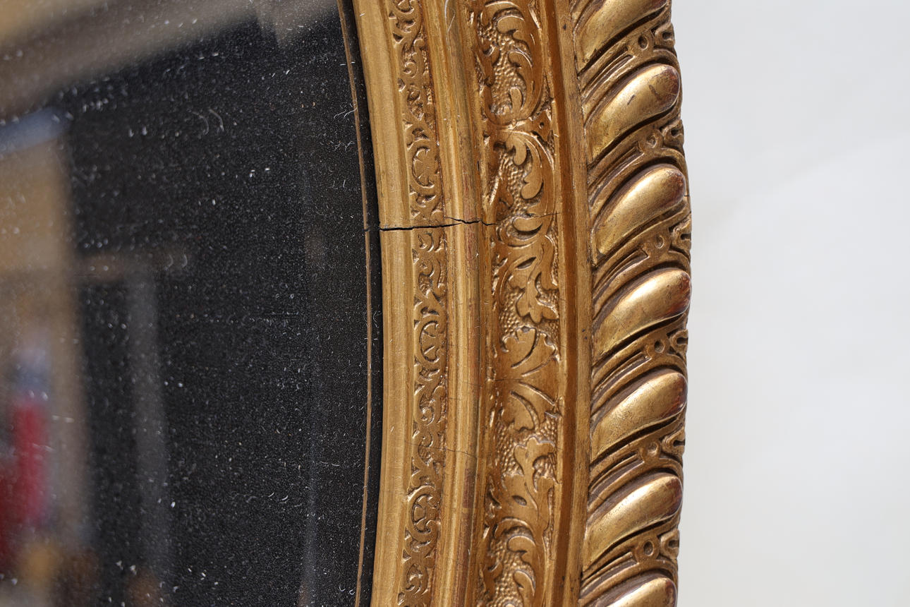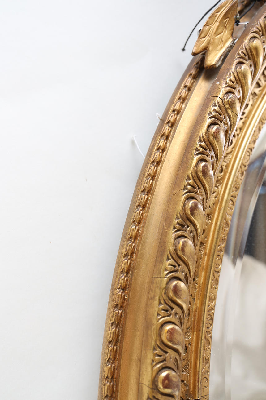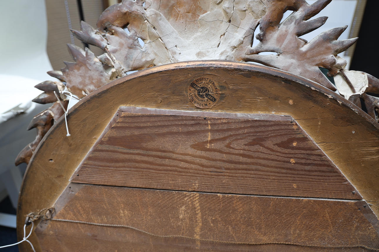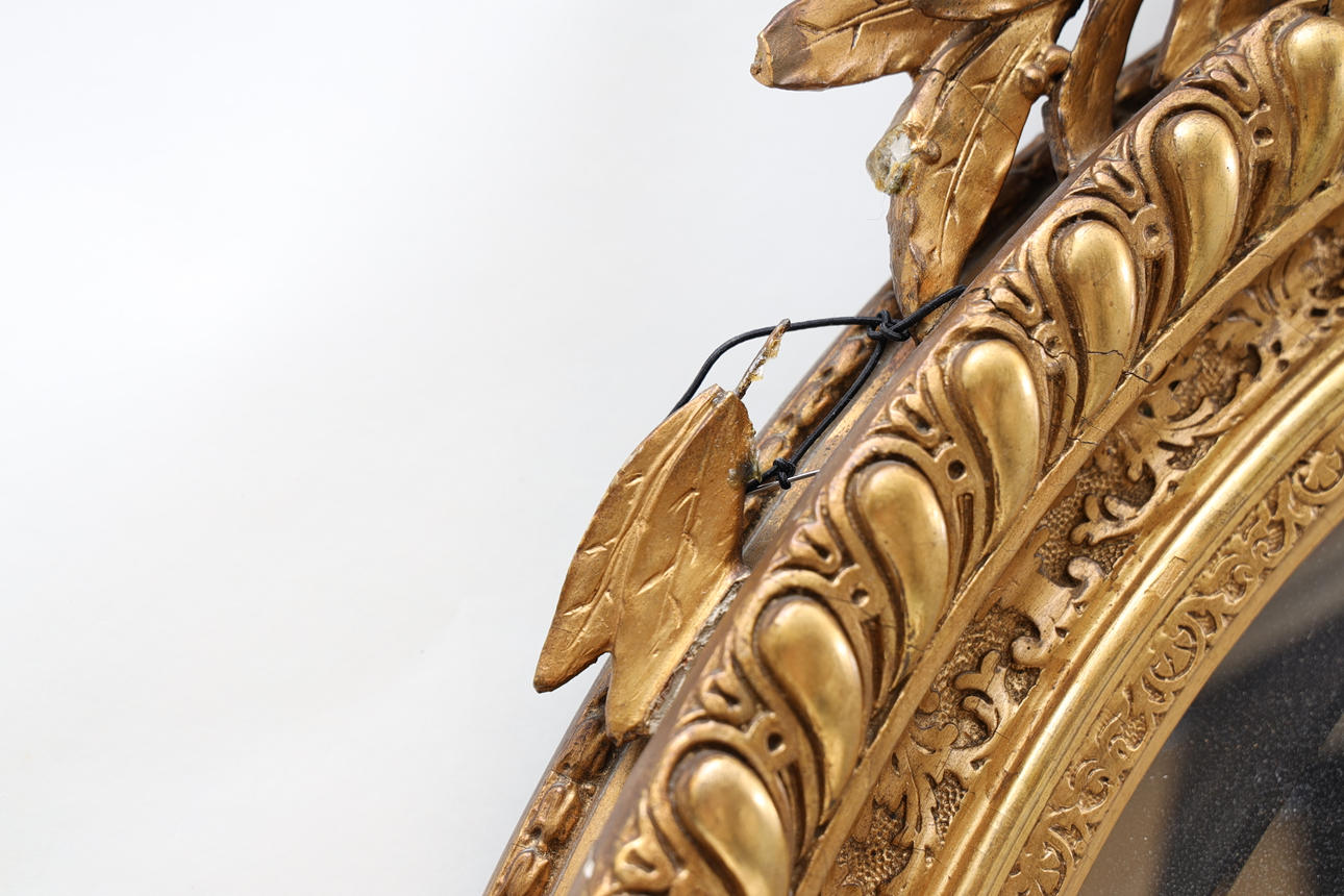 Bronzed and gilded. Decorated with bay leaves and mussel formation. Decorate in pastel lacquer. Partially openwork crest. Labeled.
