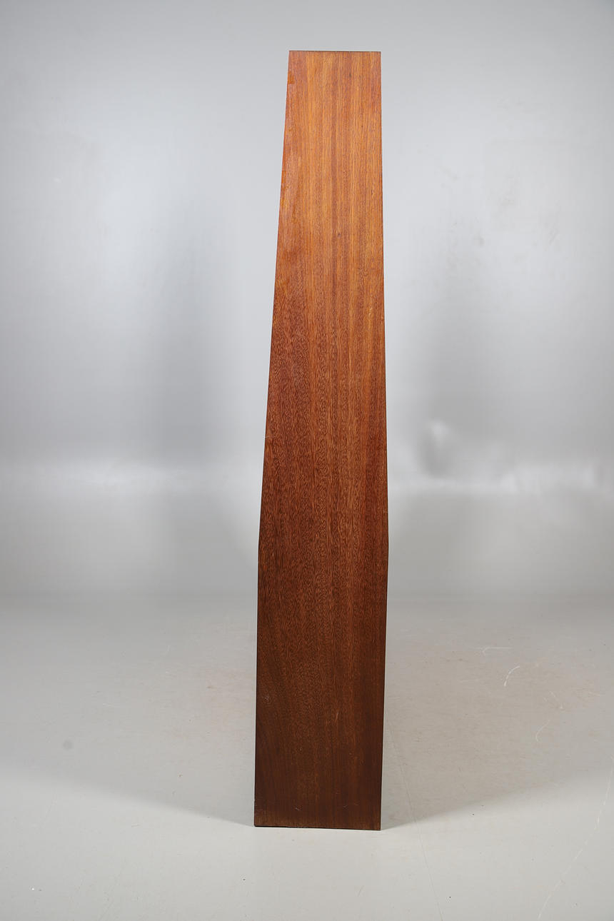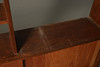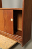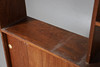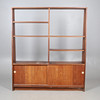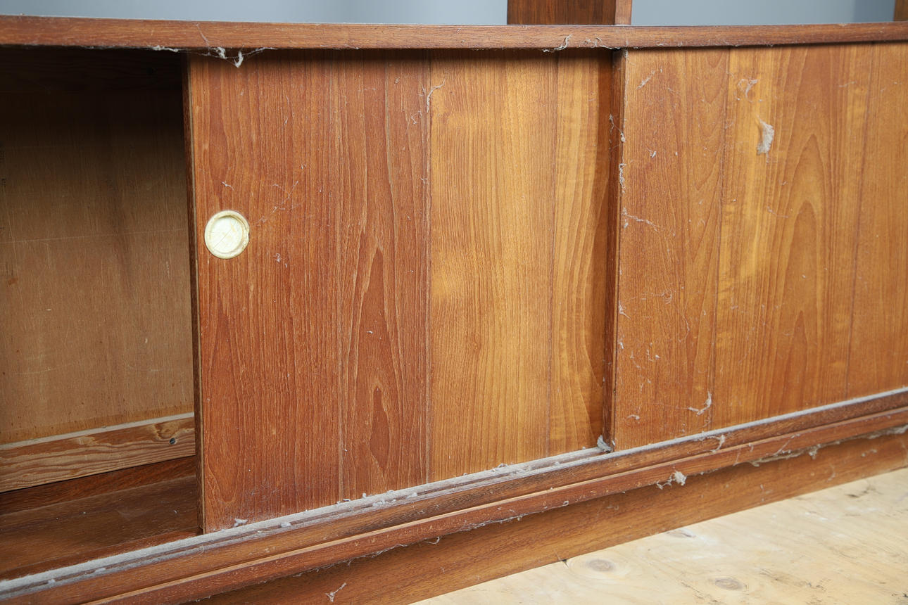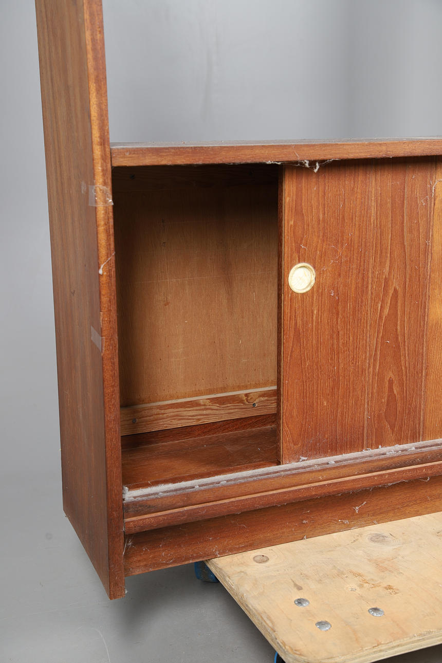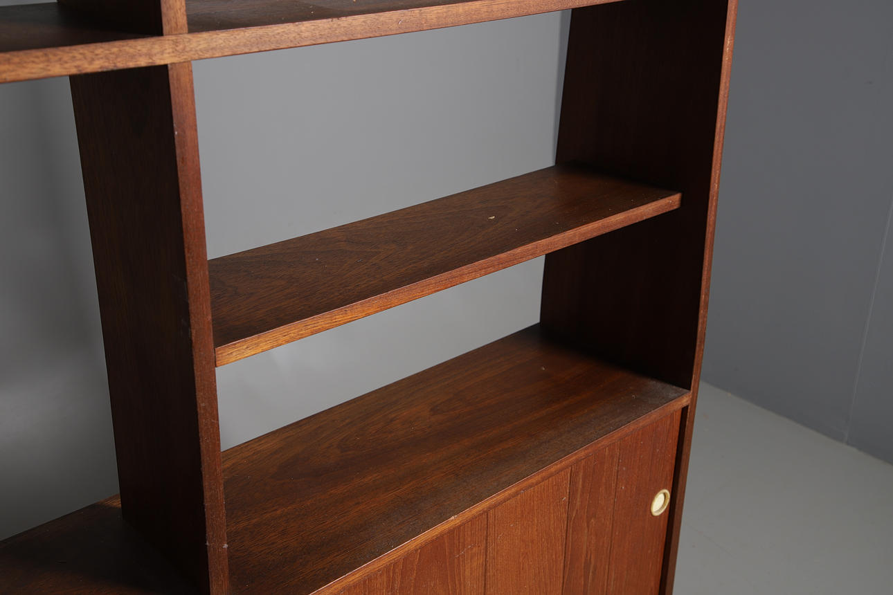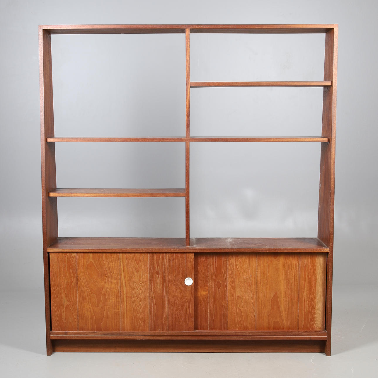 A large teak double sided mid century room divider/bookcase, with sliding doors to each side and open shelves to the top section. 174.5cms high, 153cms across.