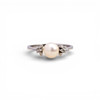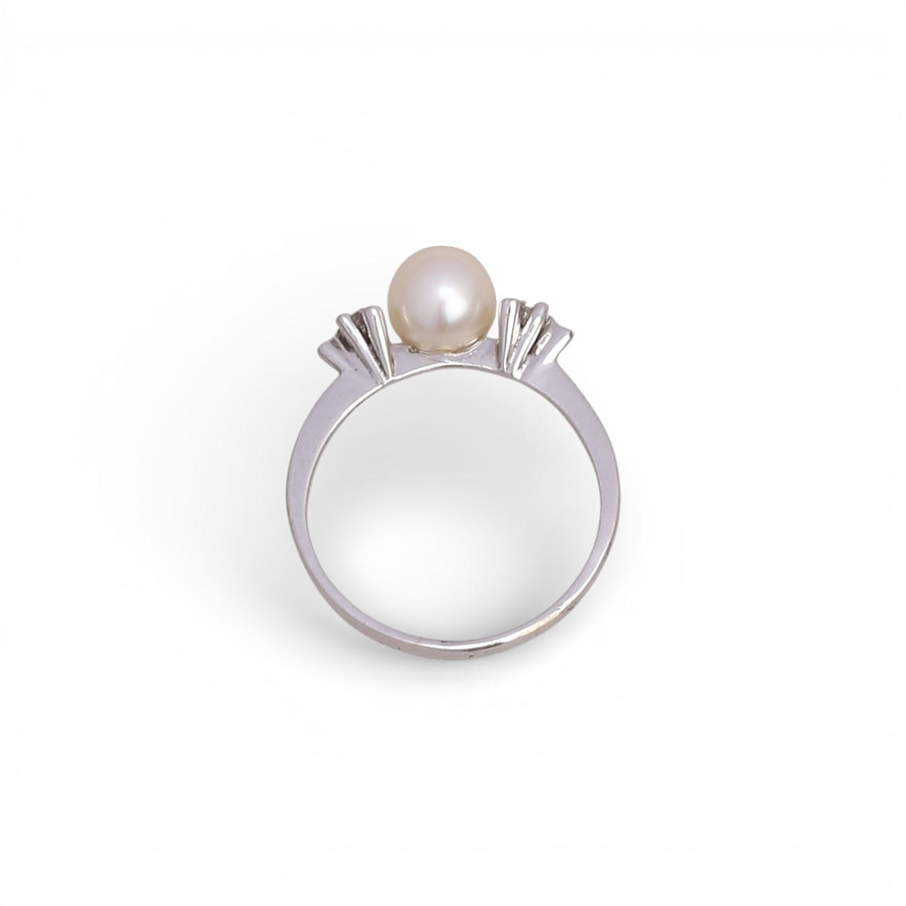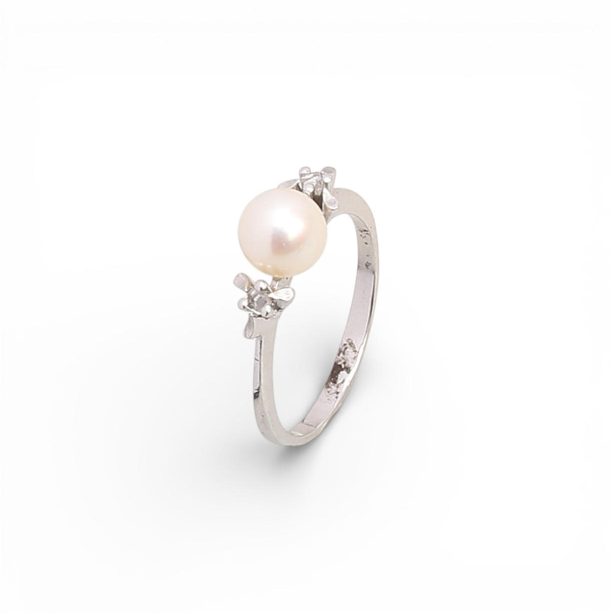 18K white gold, rose cut diamonds, approx. 0.03 cts., and cultured pearl of 6 mm in diameter. Size 11/51. 2 gr.