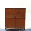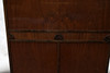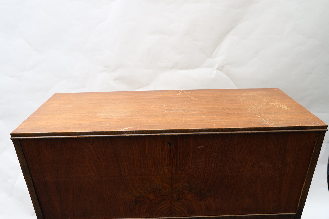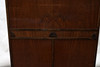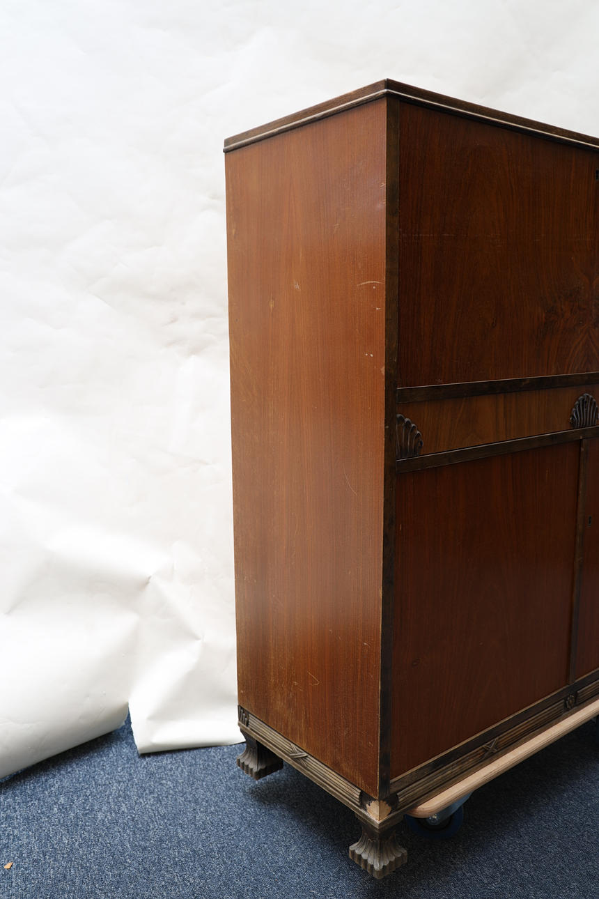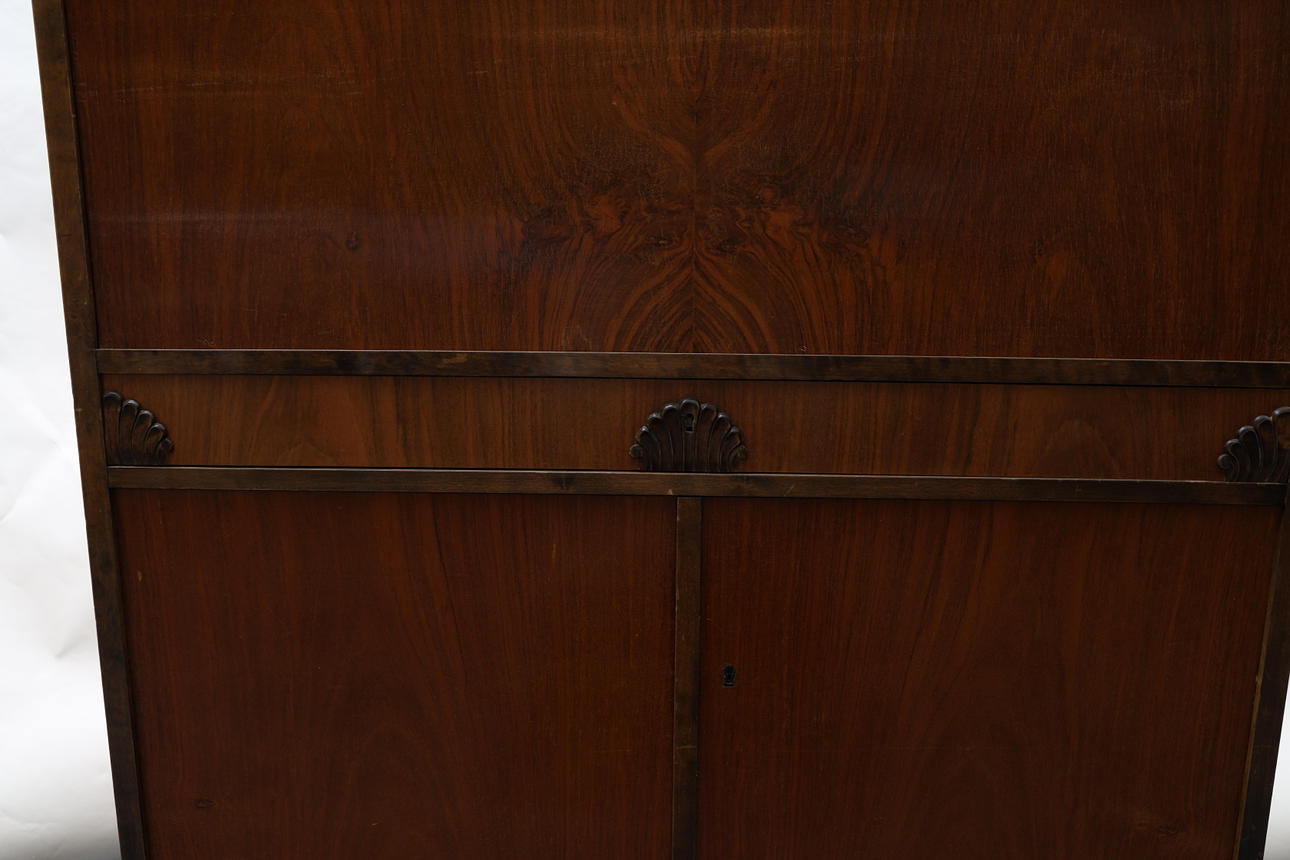 Veneered in different types of wood, a hatch, double doors. Cut decor. Height 110 Width 101 Depth 38cm.