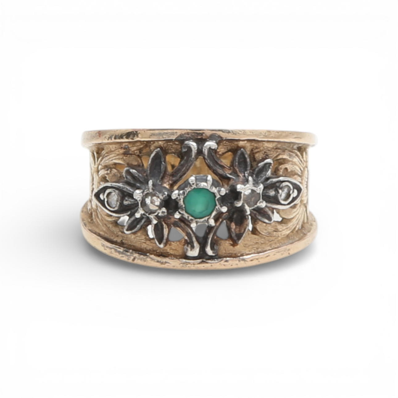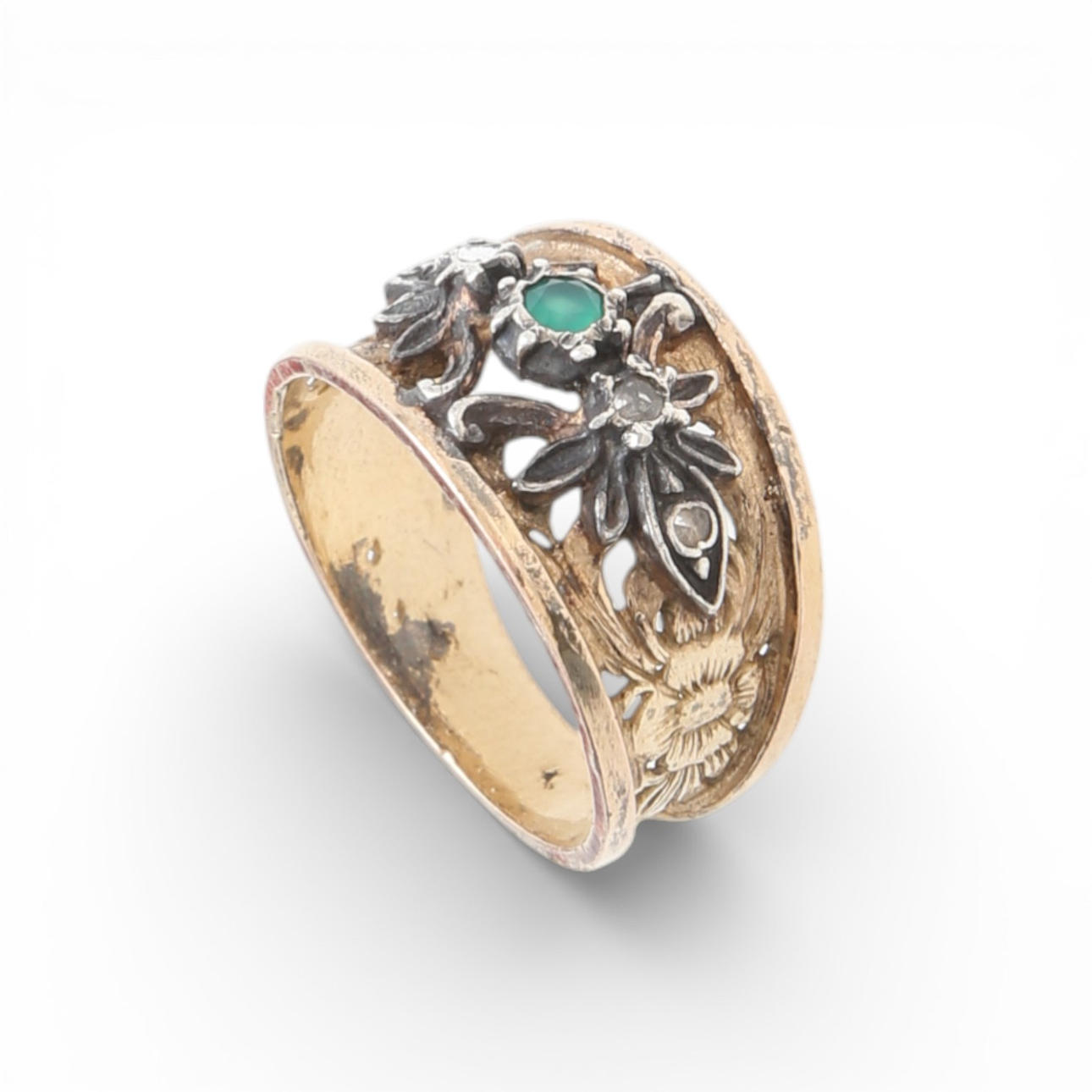Silver and over-gilded silver, round cut chrysoprase and rose cut diamonds, approx. 0.03 cts. Brooch: 4.4 x 4.3 cm. Ring size 13/53. 10.8 gr.