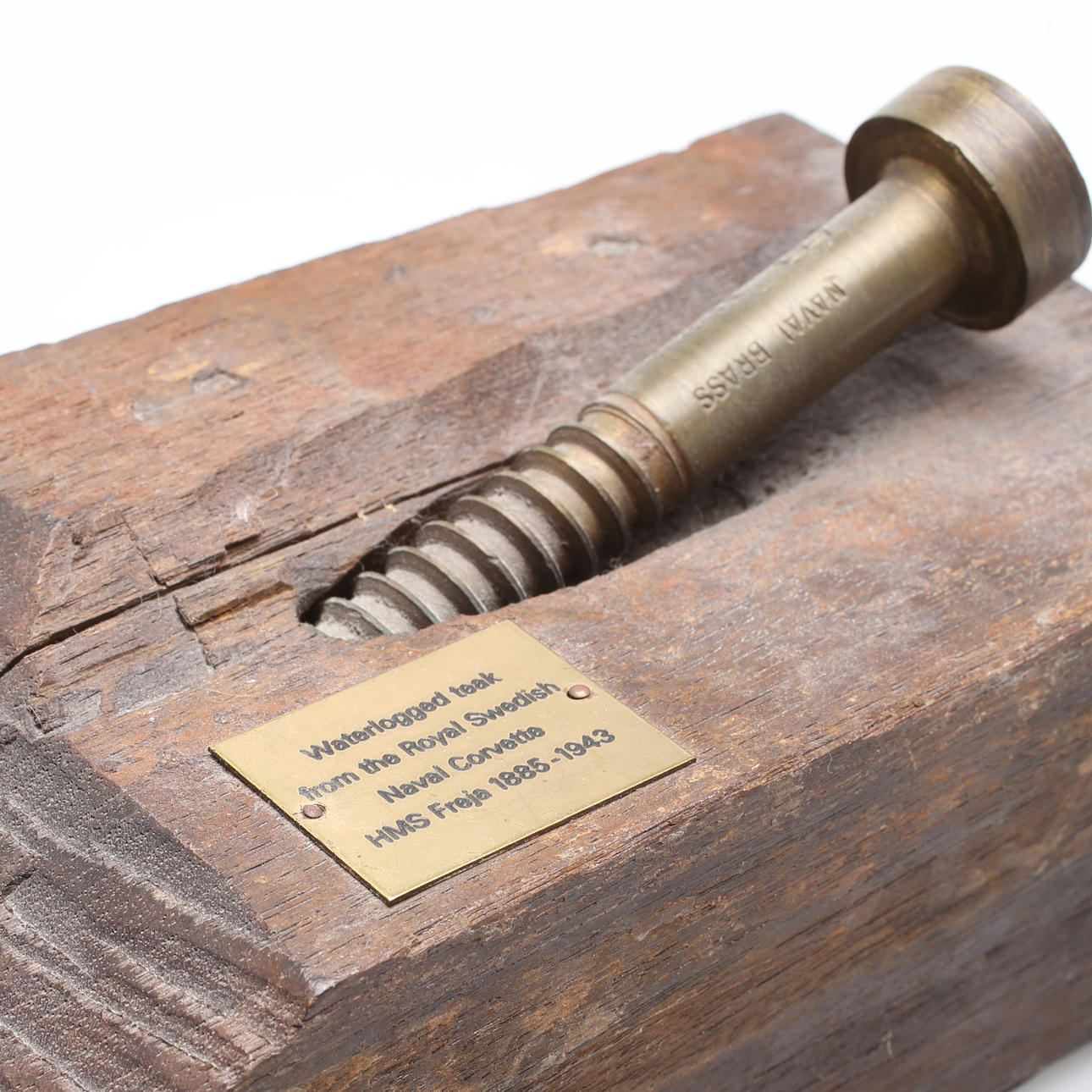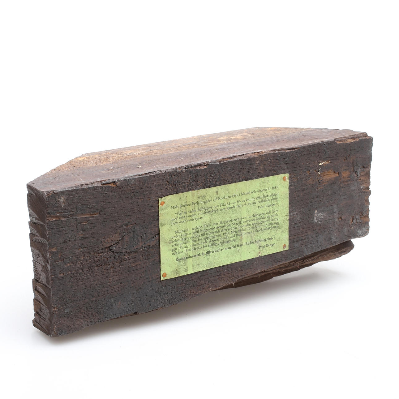 Plaque: Waterlogged teak from the Royal Swedish Naval Corvette HMS FREJA 1885-1943.