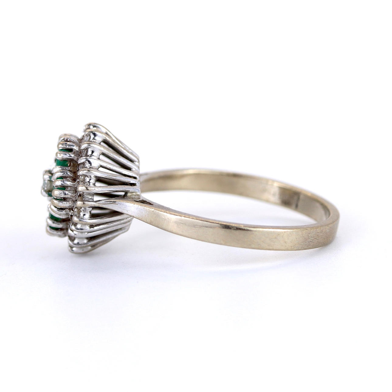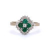 A vintage hallmarked 18ct yellow gold ring set with four emeralds and diamonds. UK ring size P.