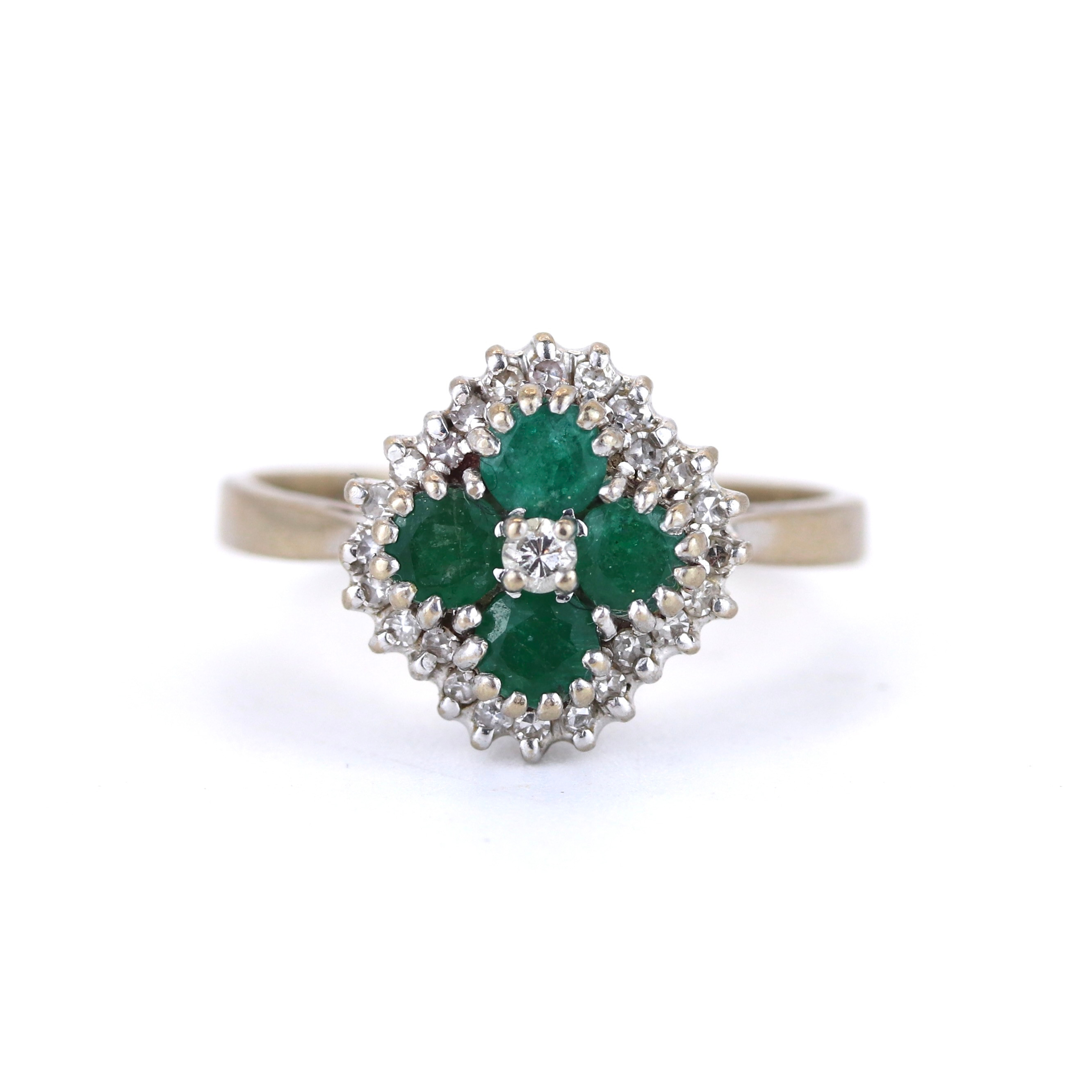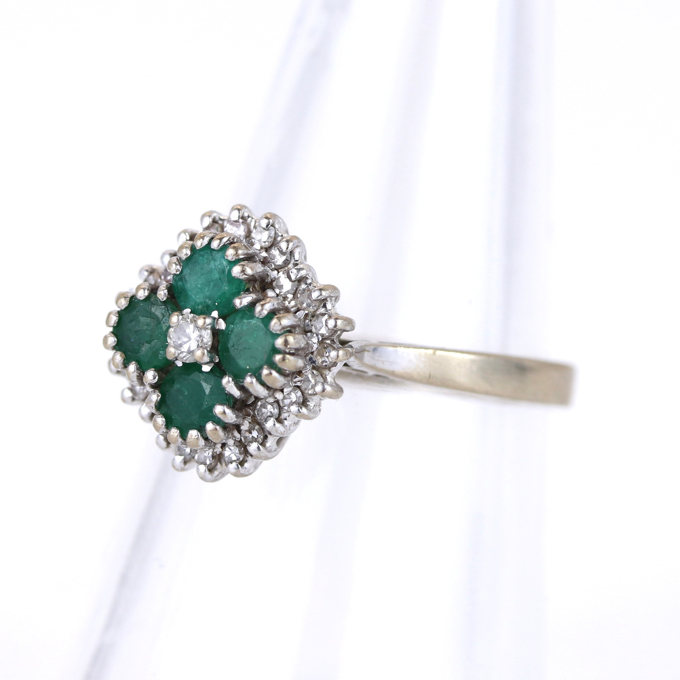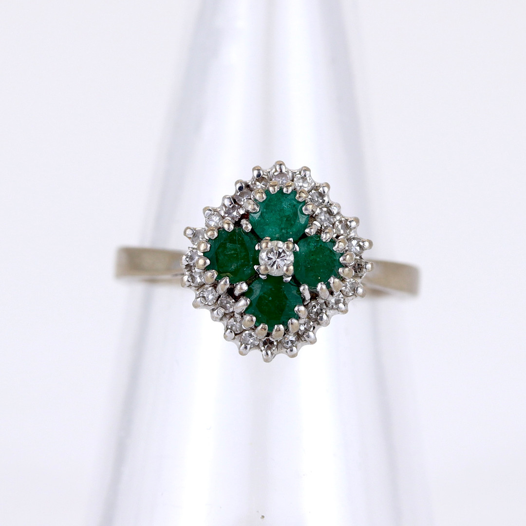 4874573. 18CT EMERALD AND DIAMOND RING.