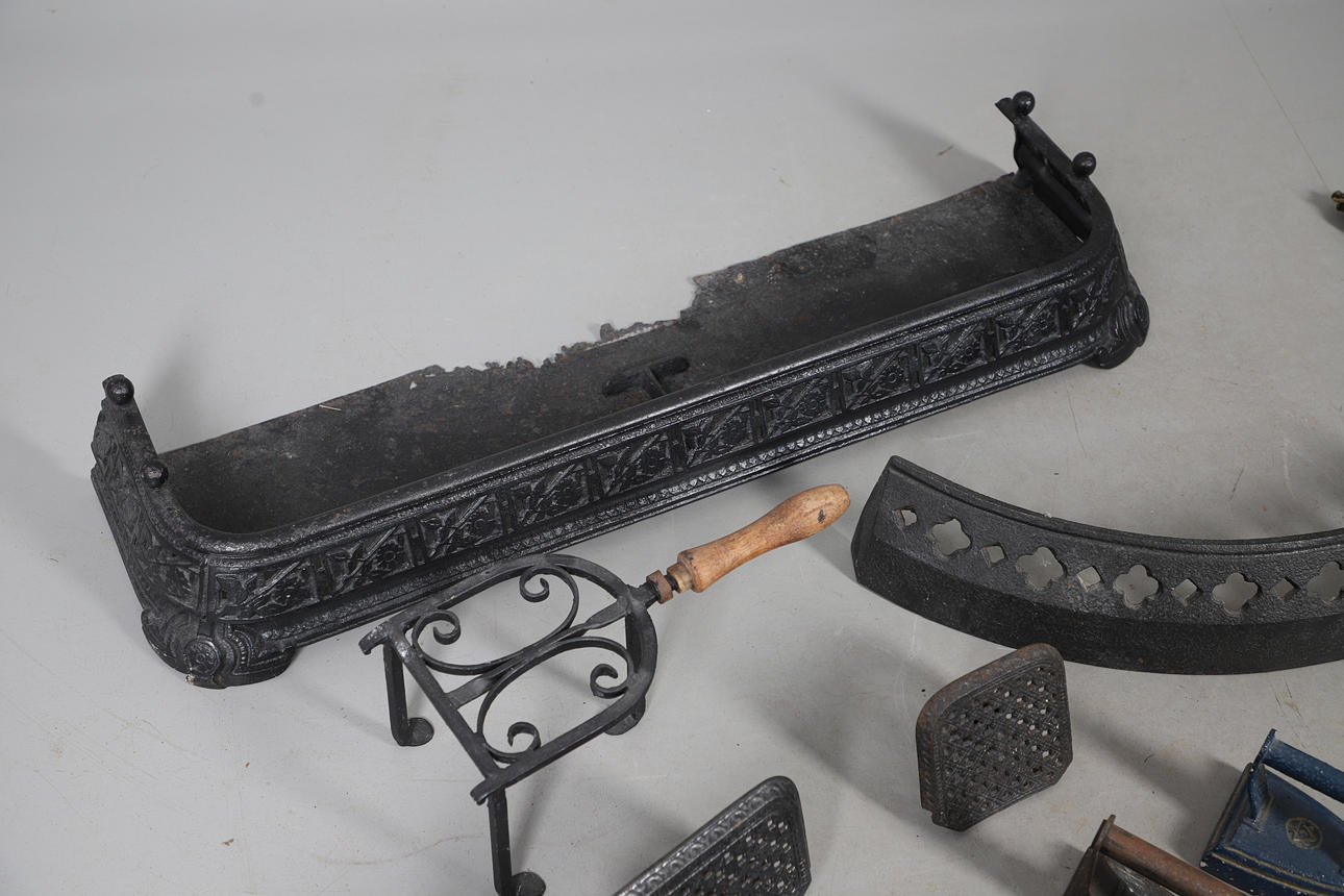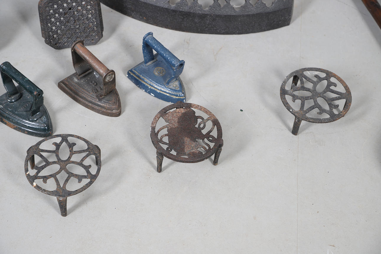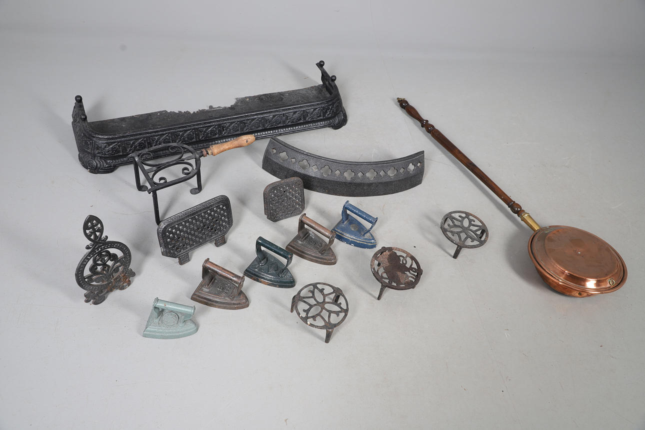 CAST IRON FIRE KERBS, FLAT IRONS, TRIVETS WARMING PAN.