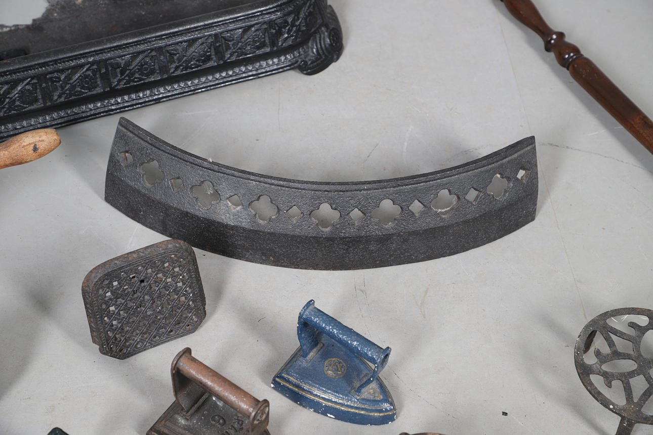 4874805. CAST IRON FIRE KERBS, FLAT IRONS, TRIVETS WARMING PAN.