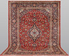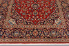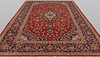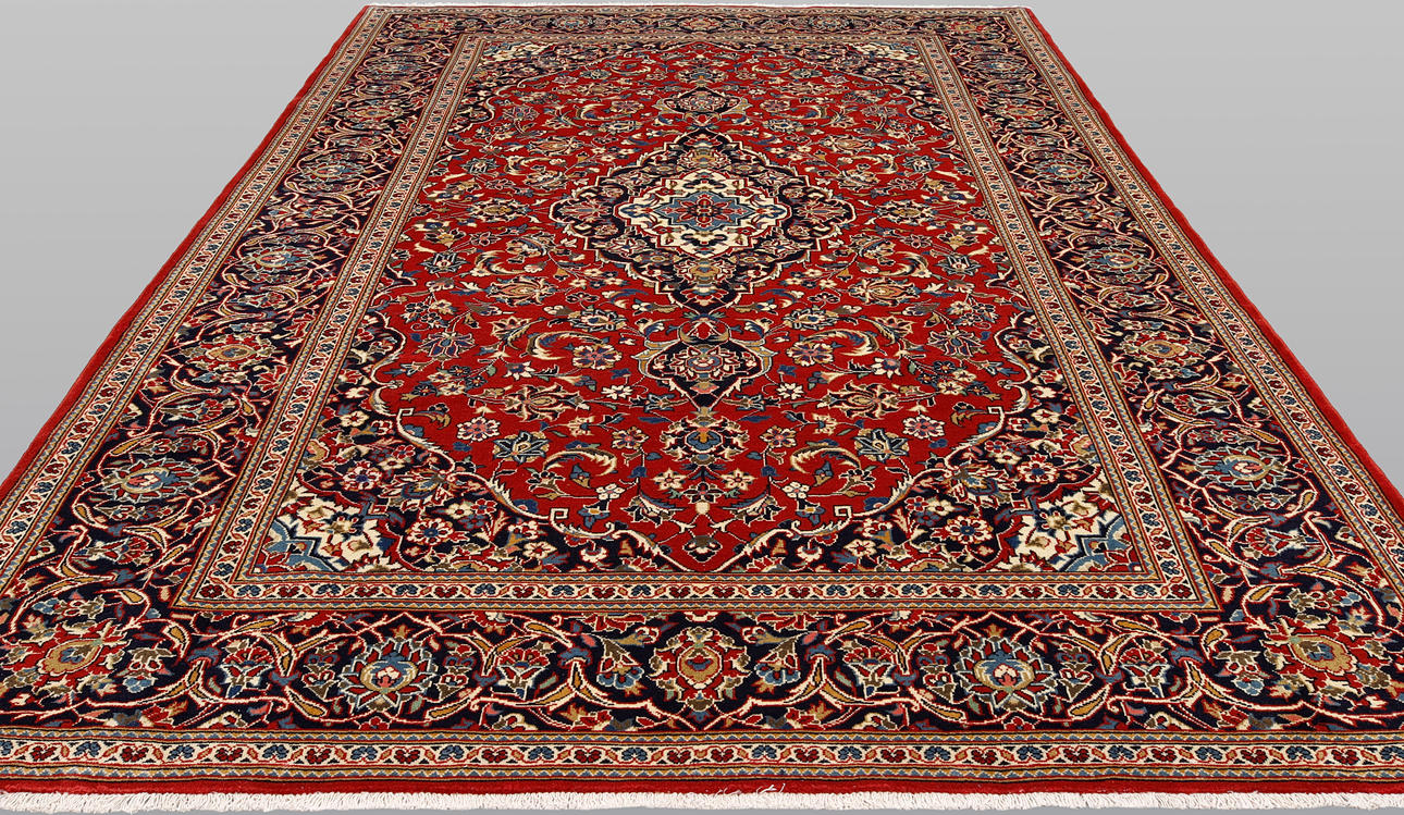 Keshan with a red bottom color and a centrally placed medallion with details in blue, beige and green. The center field is covered in floral ornamentation, palmettes and arabesques in similar shades, and the corner portions follow the same pattern structure. The border has a dark bottom and decor of palm branches. The forelock is made of wool and the warp is of cotton.