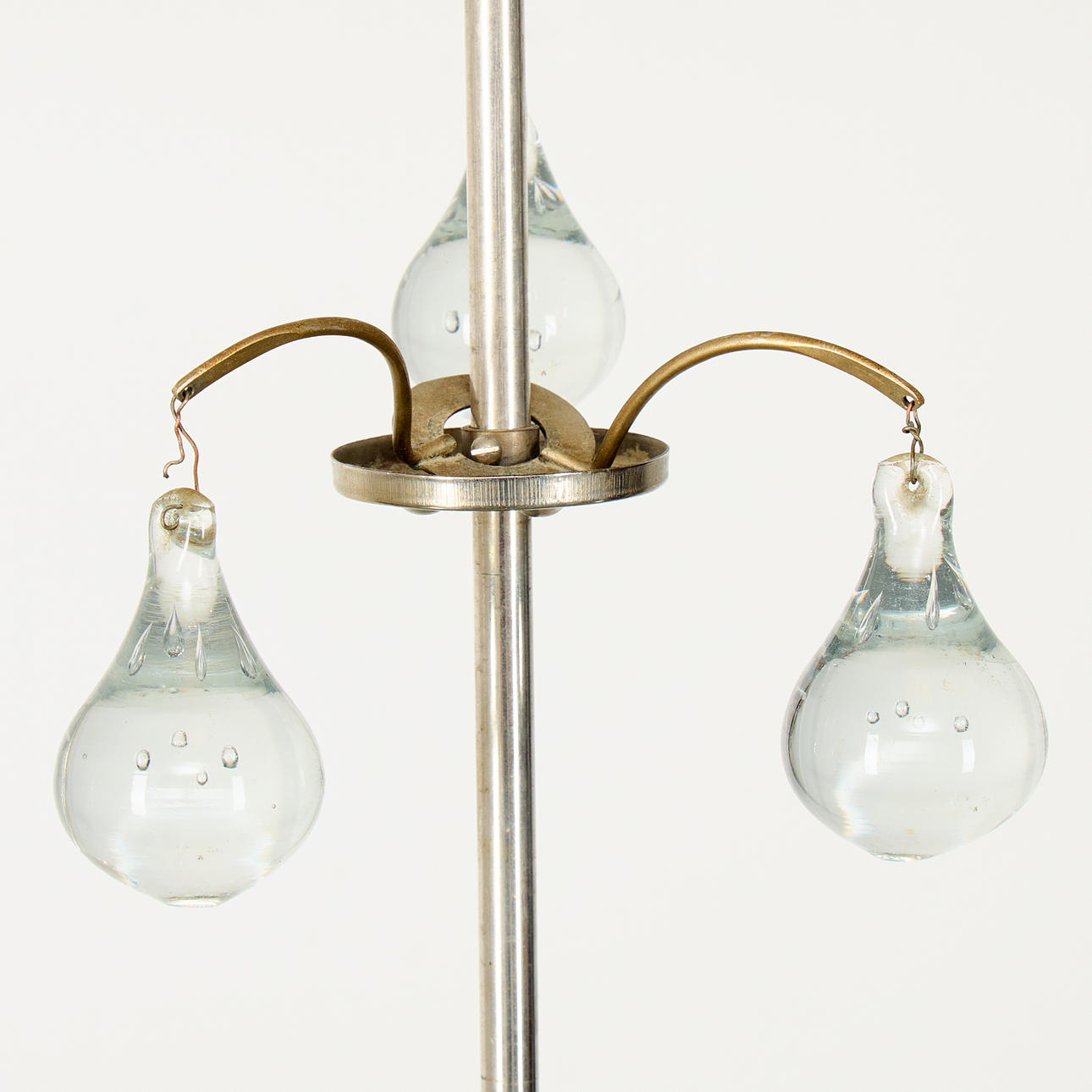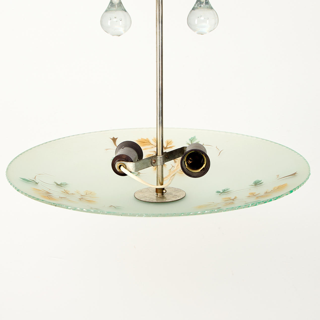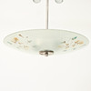 for two light points, metal frame, screen made of raw glass with painted decoration, diameter approx. 43 cm, height approx. 55 cm.