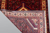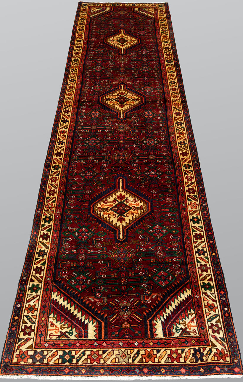 Hamadan in gallery model with red base color and a geometric pattern with medallions in beige, green and blue. The border has a yellow bottom color with a decor of stylized flowers. The bangs are made of wool and the warp is made of cotton.