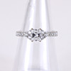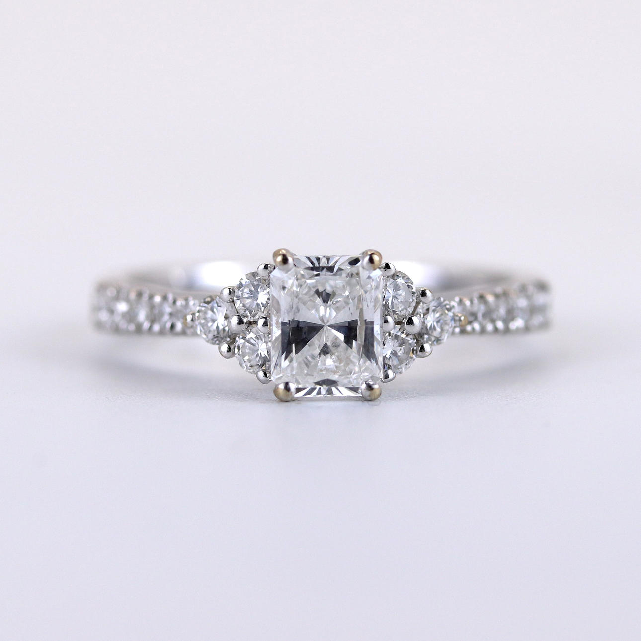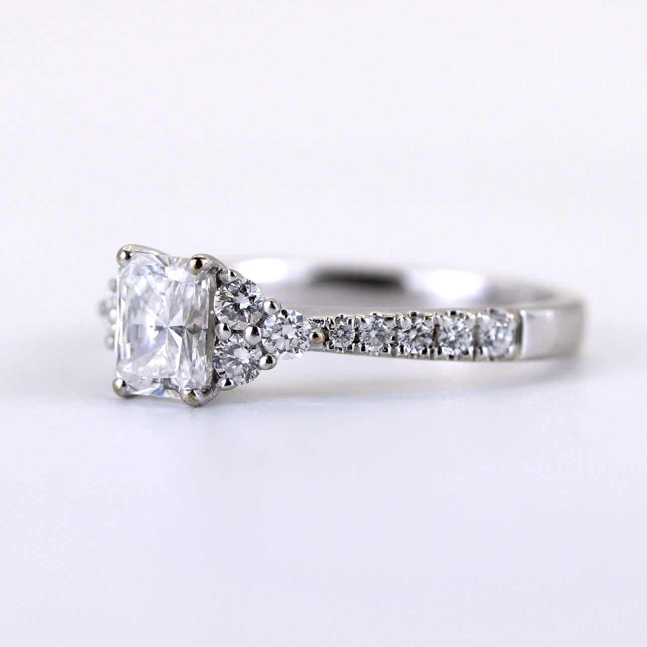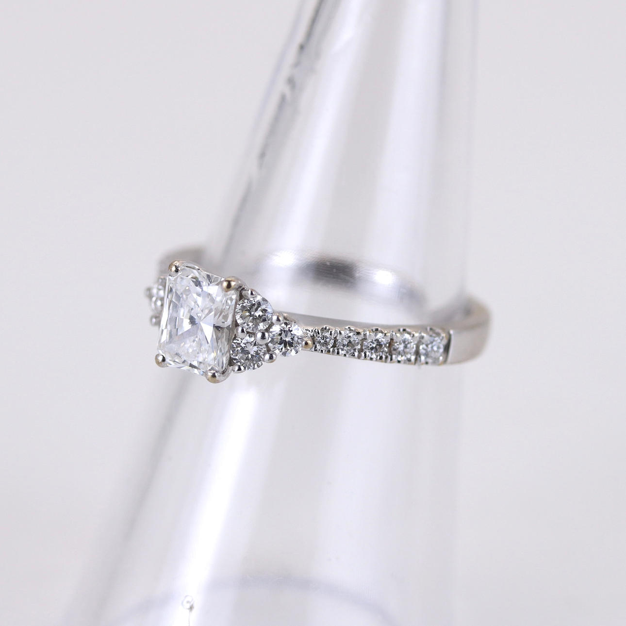 An 18ct white gold ring set with a rectangular modified brilliant cut diamond, approx 0.7ct with diamond set shoulders. UK ring size M.5