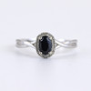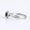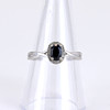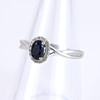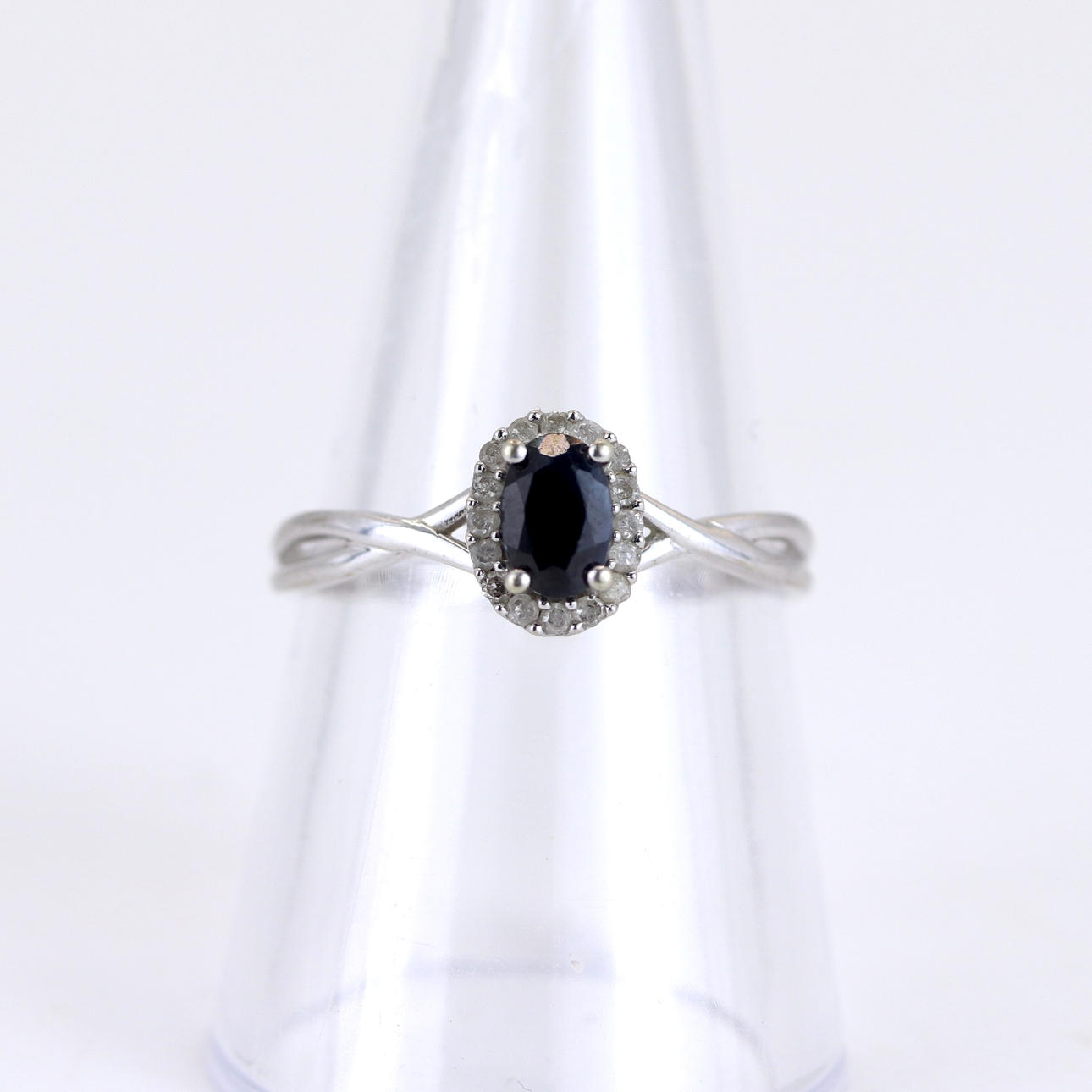 A 9ct white gold ring set with a sapphire surrounded by diamonds. UK ring size Q.