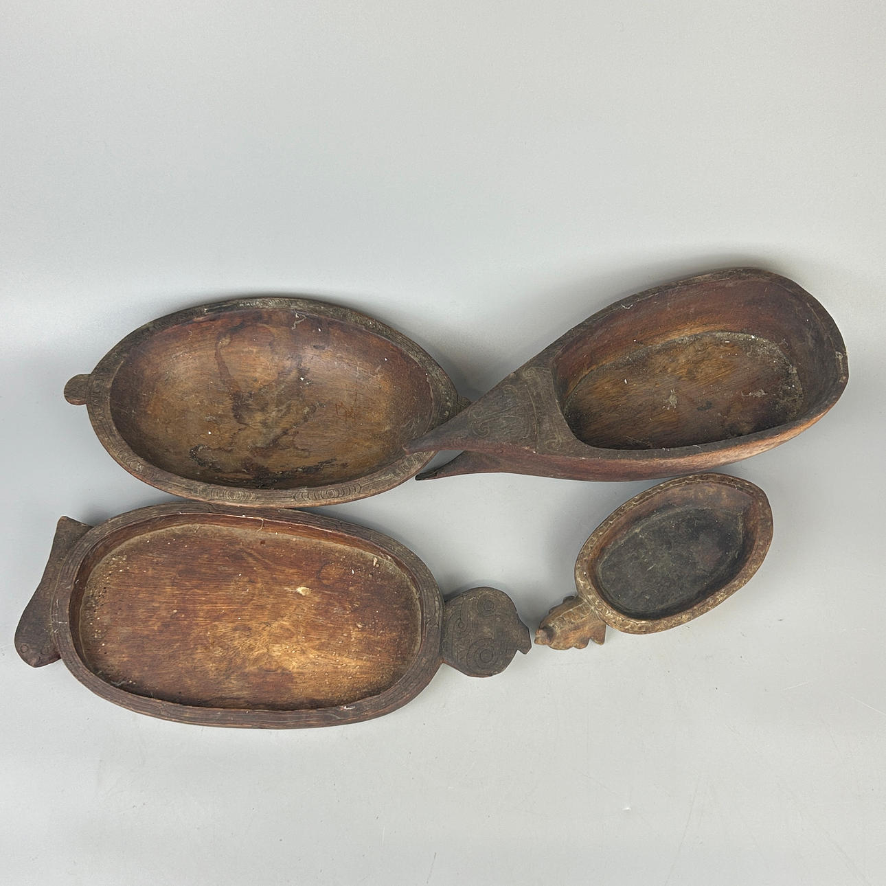 FOUR OCEANIC WOODEN BOWLS.