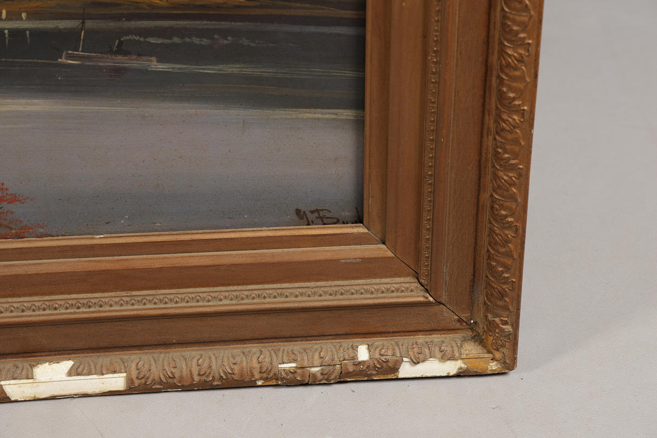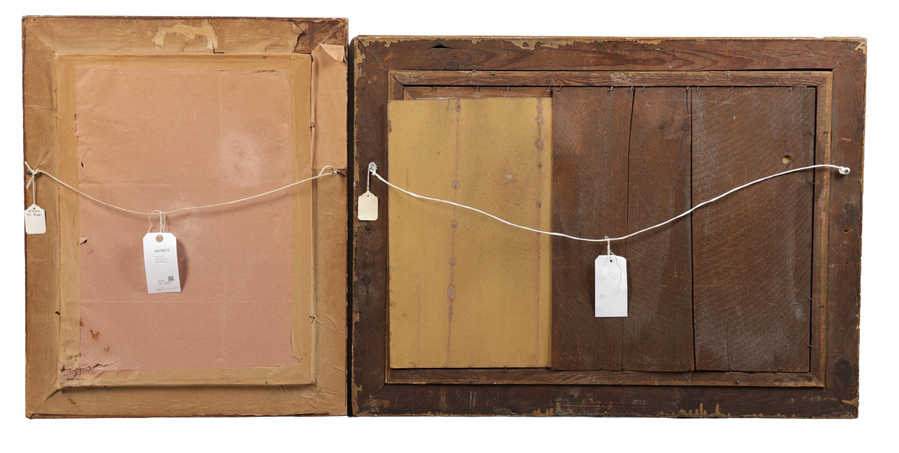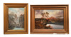 The first signed A. St. Claire, oil study of a waterfall surrounded by trees, housed in a gilt and glazed frame, 60cm wide, 75cm high including frame, together with an oil landscape of figures fishing by a lake, possibly signed Burgess?, housed in a gilt frame, 95cm wide, 71.5cm high including frame (2).