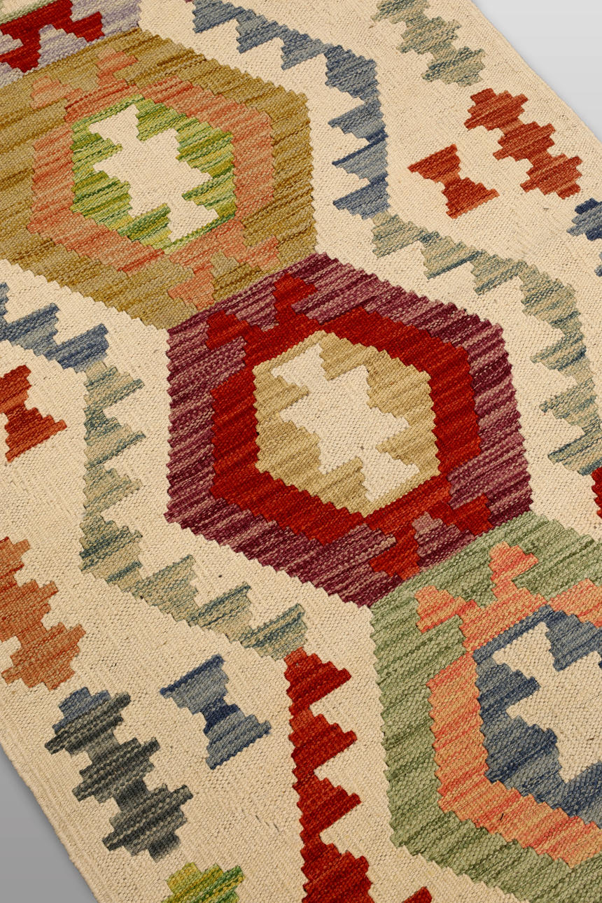 Hand woven Kelim gallery model in classic design with geometric pattern in polychrome color scale.
