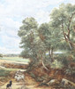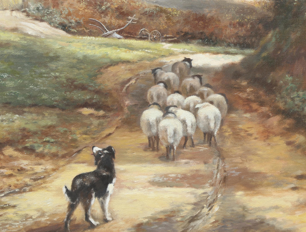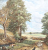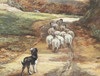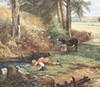 Kids drinking out of creek, sheep, dog.