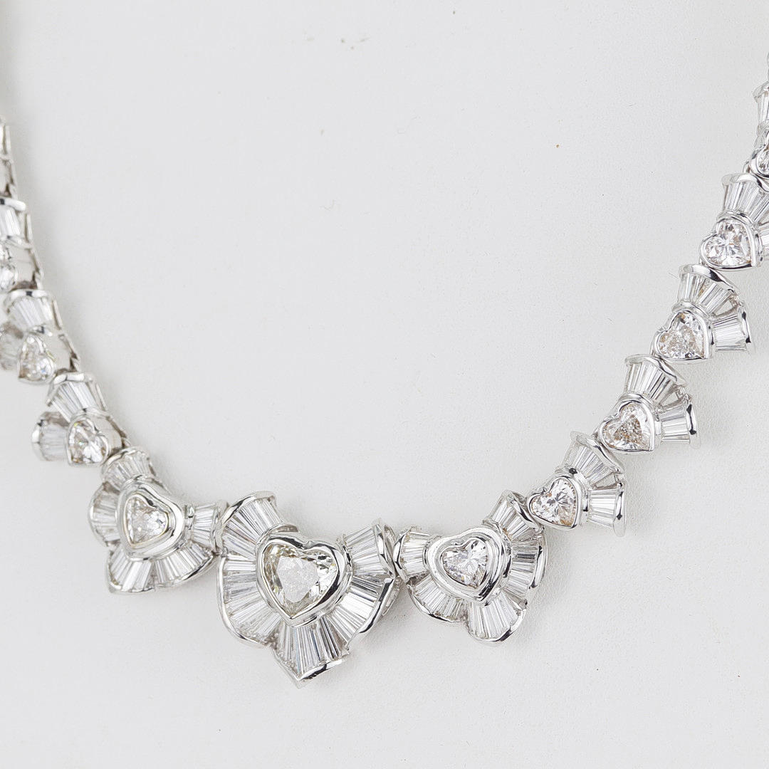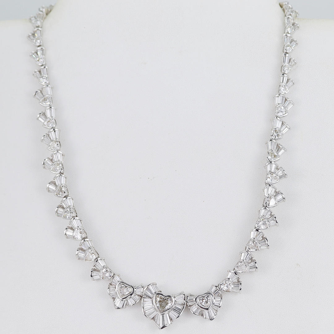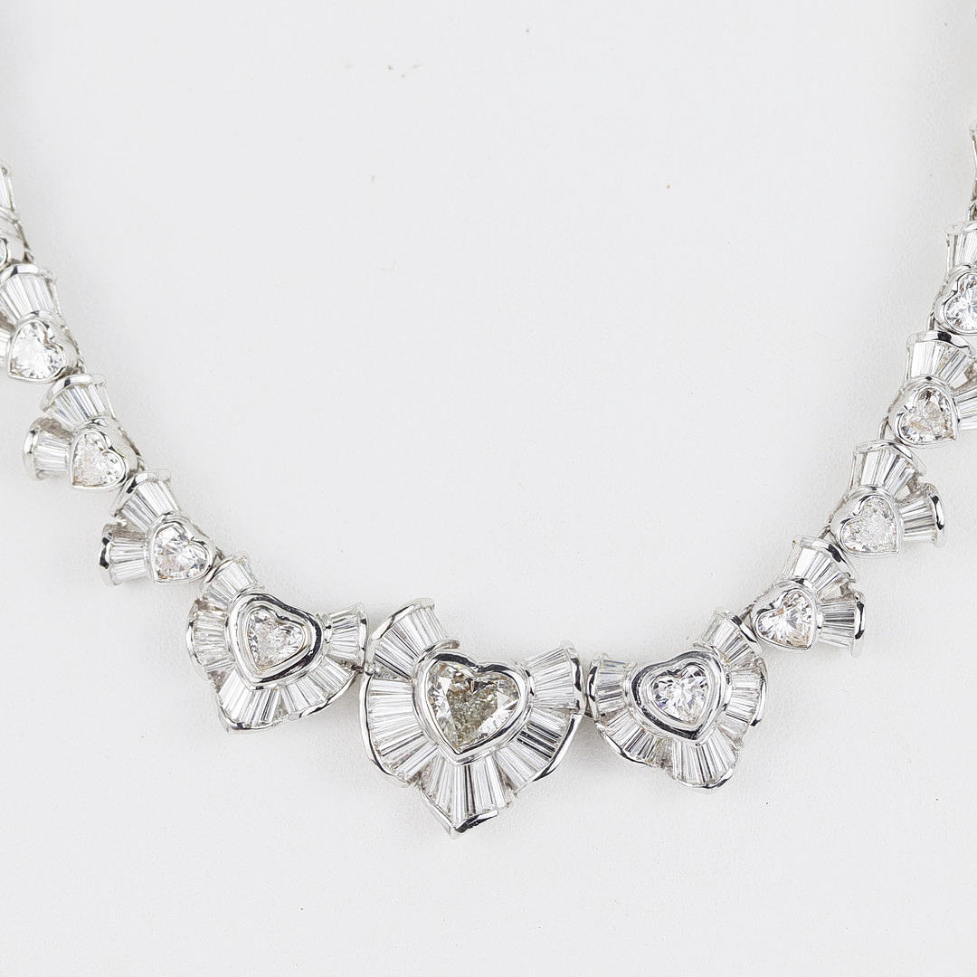 An 18ct white gold necklace set with baguette and fancy heart cut diamonds, overall approx. 40ct diamonds, with WGI certificate, colour H-I-J, clarity VS2-SI1, length 42cm.