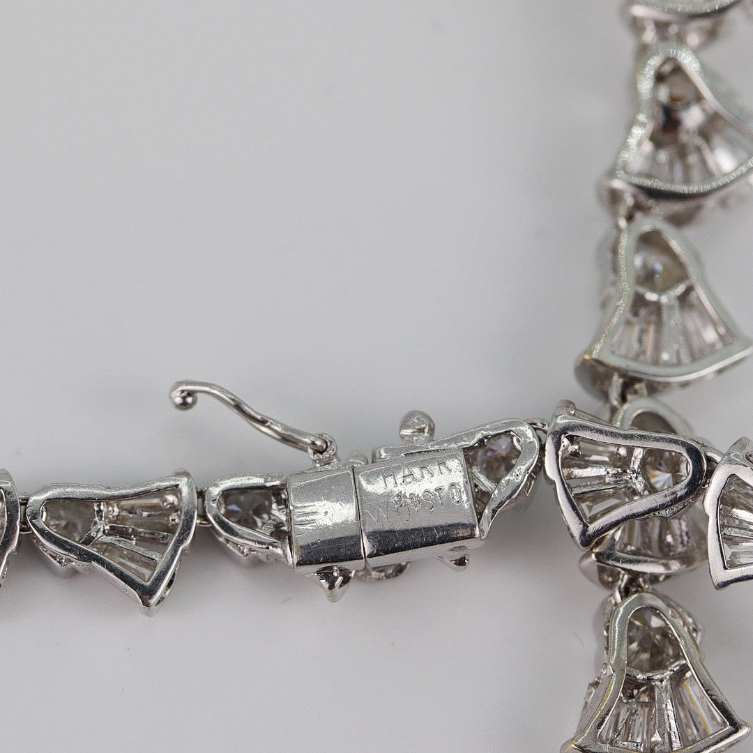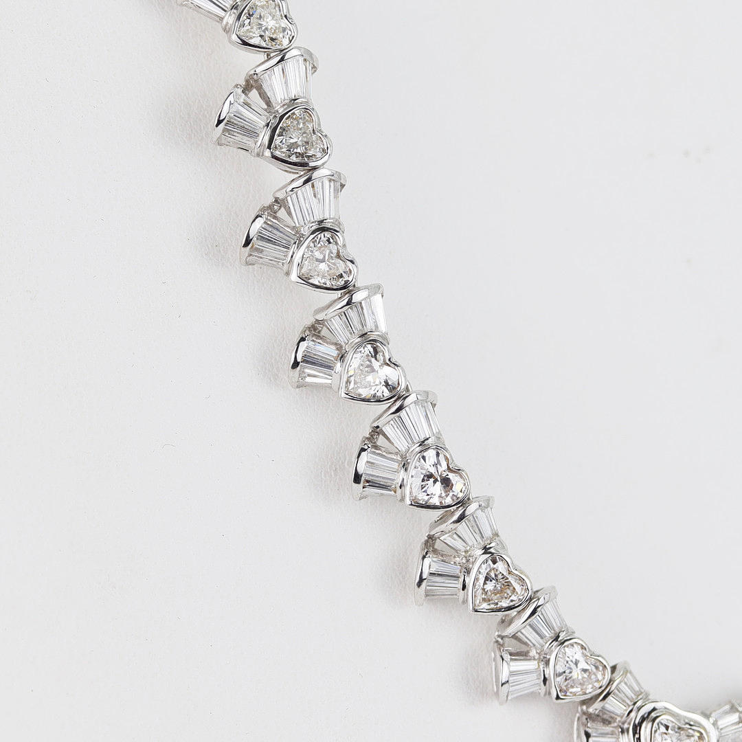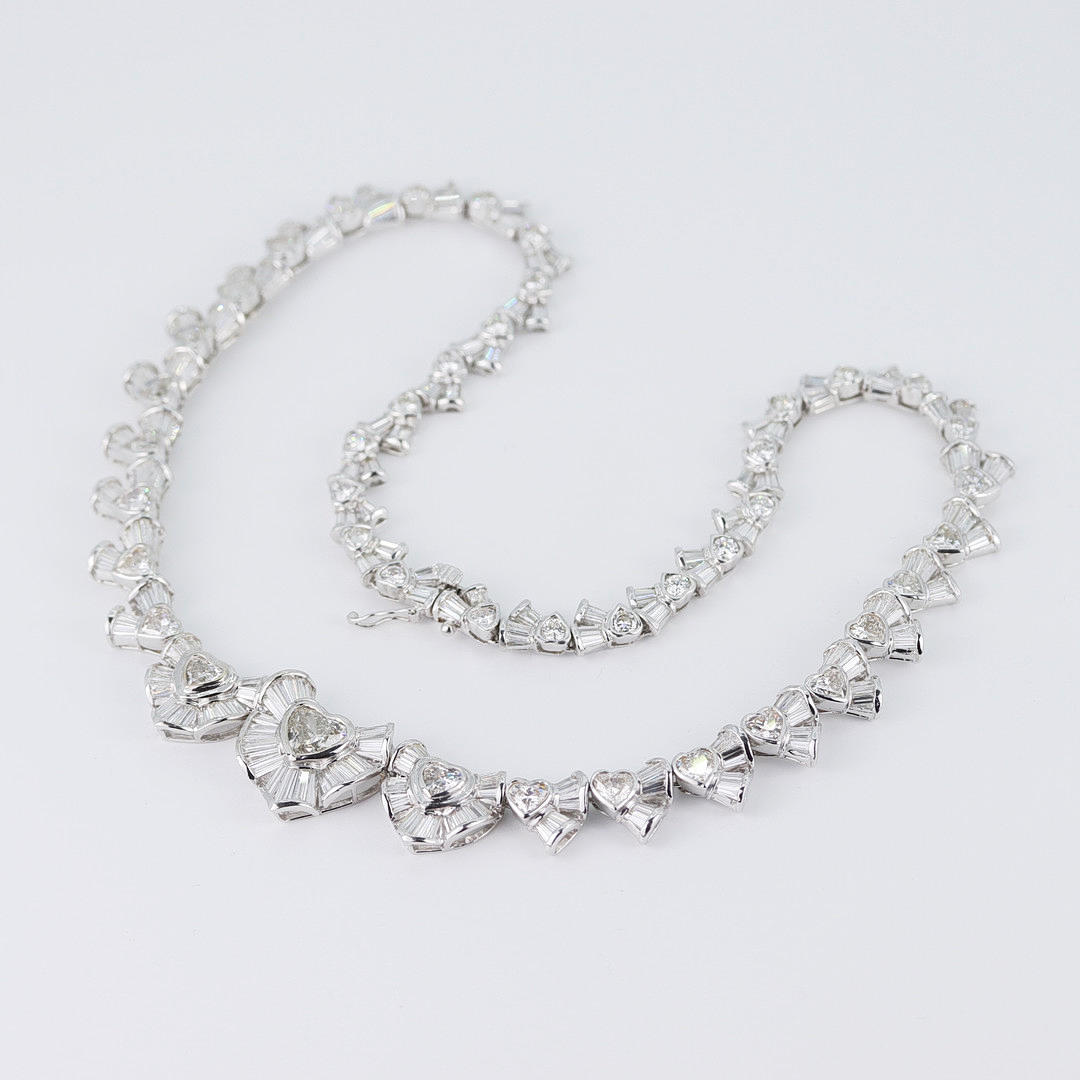 An 18ct white gold necklace set with baguette and fancy heart cut diamonds, overall approx. 40ct diamonds, with WGI certificate, colour H-I-J, clarity VS2-SI1, length 42cm.