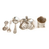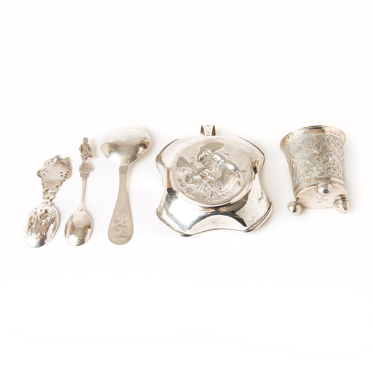 Beaker with a height of about 7 cm. spoons with a length of about 11.5 - 15.5 cm. Fal with a length of about 13,5 cm. Total weight: 237 g.