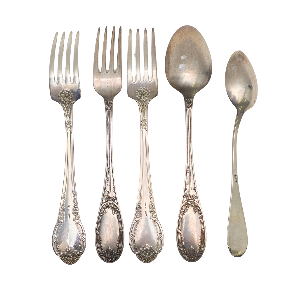 4881608. 3 FORKS AND 2 SPOONS WITH SILVER ANAGRAM.