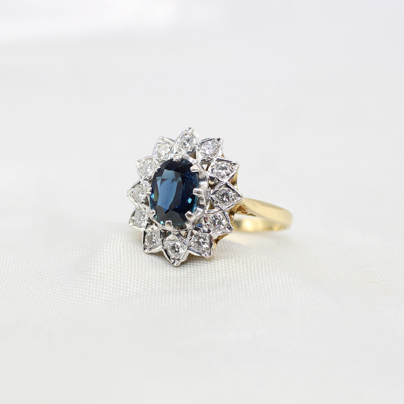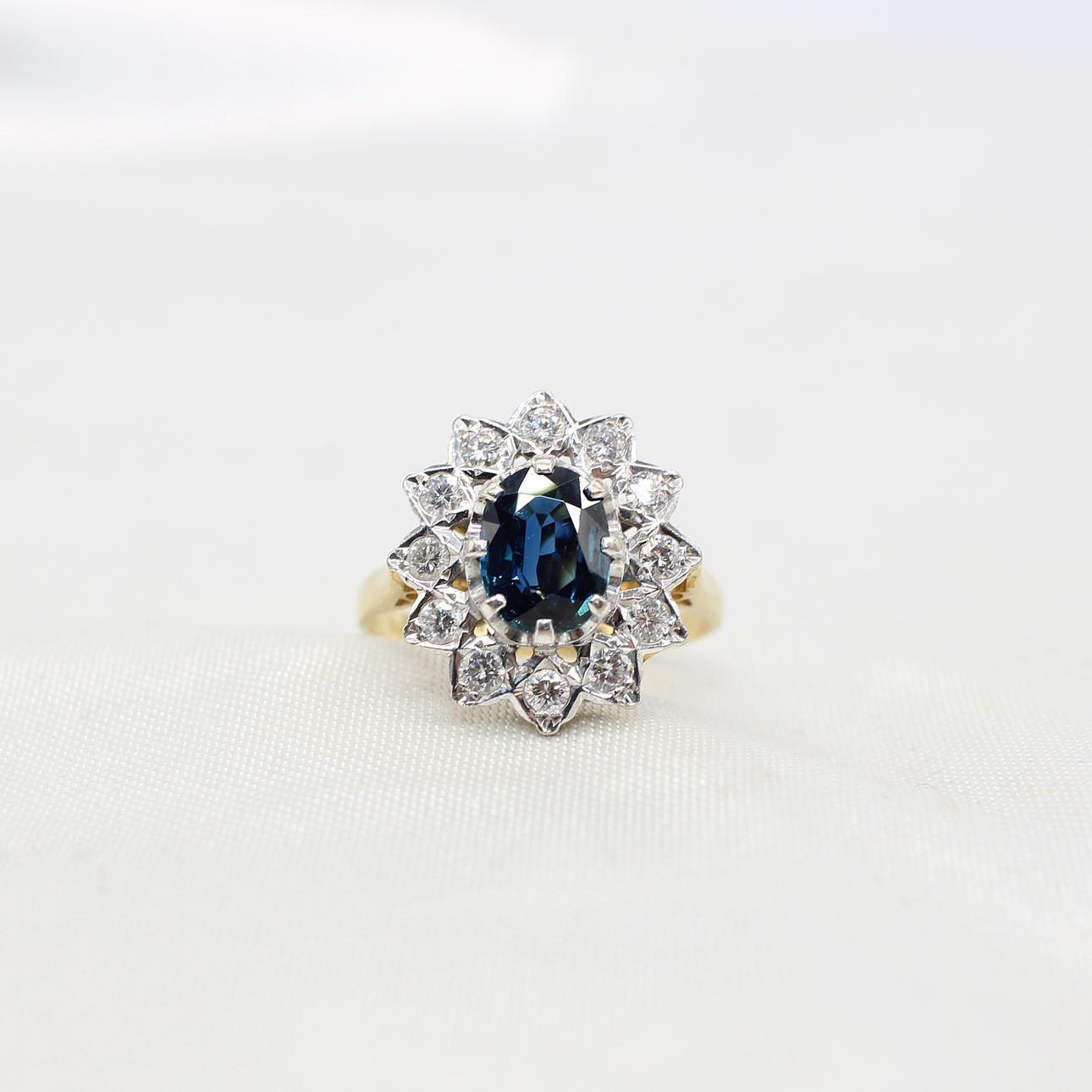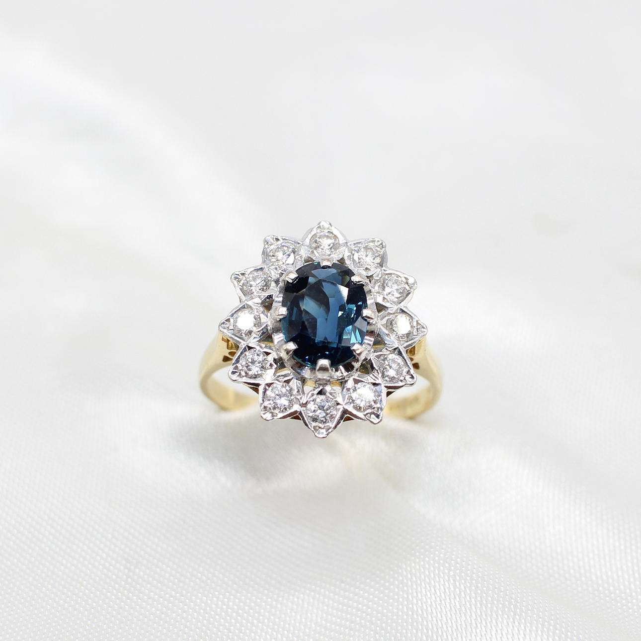 An 18K Yellow Gold (Hallmarked) Oval Sapphire And Round Brilliant Cut Diamond Cluster Ring.