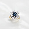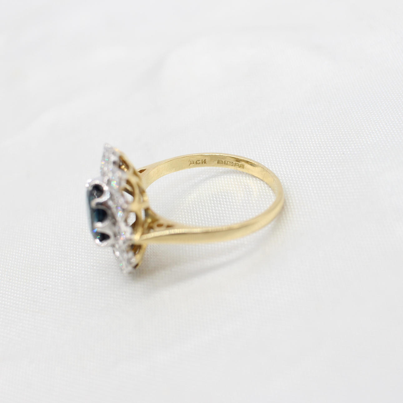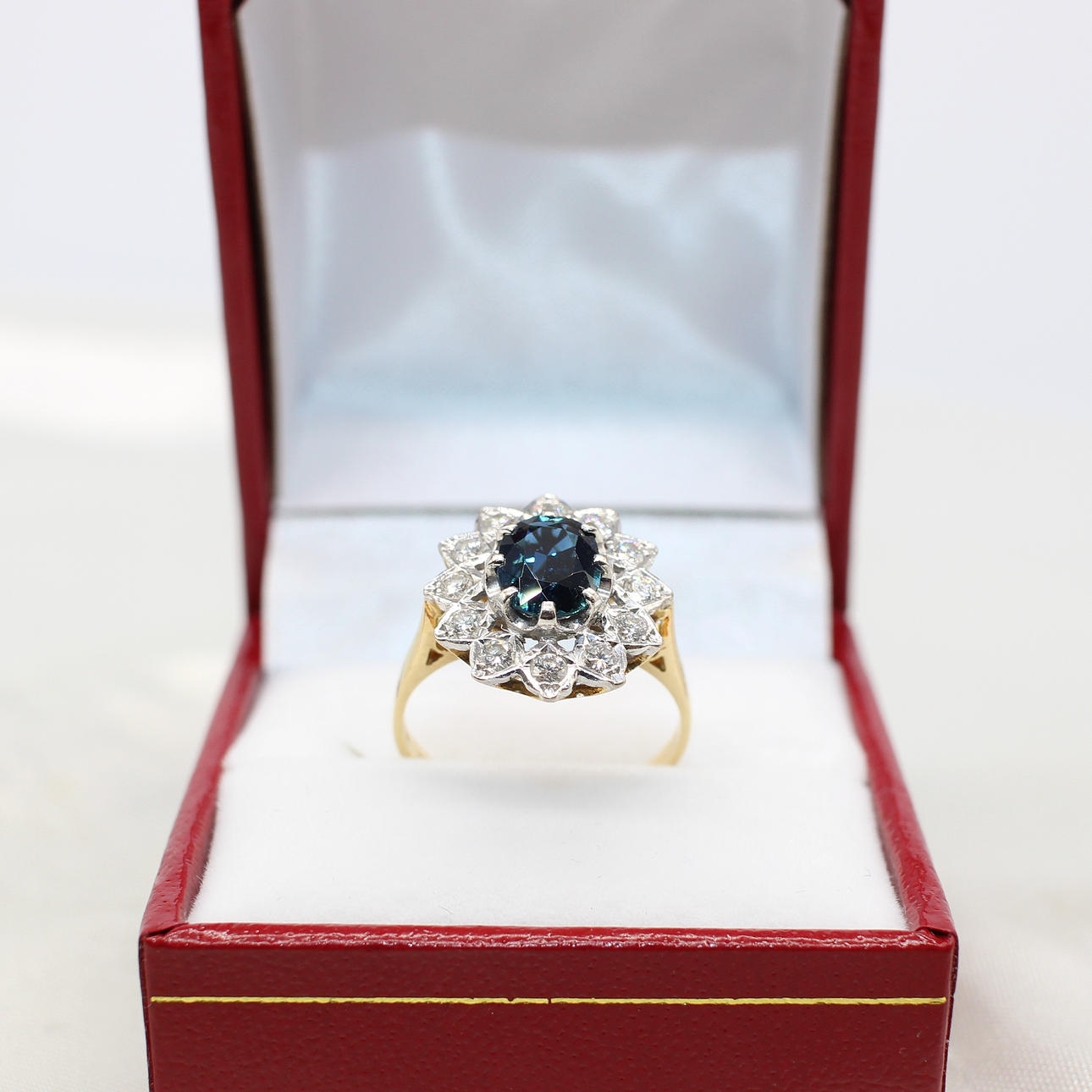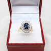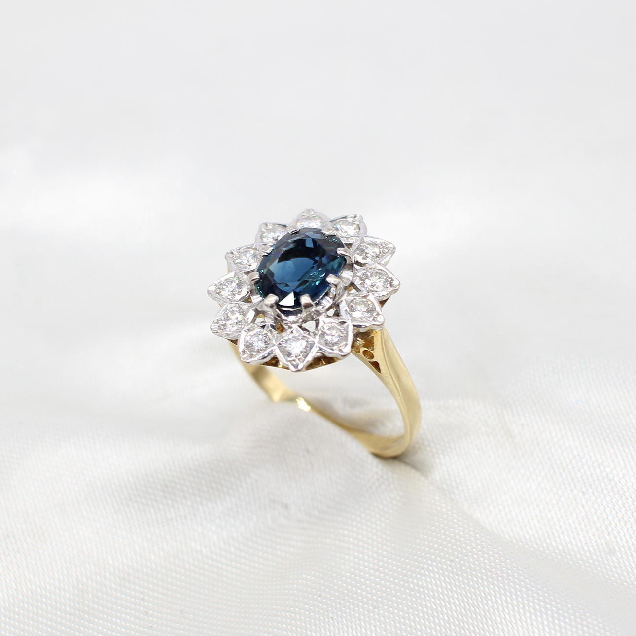 An 18K Yellow Gold (Hallmarked) Oval Sapphire And Round Brilliant Cut Diamond Cluster Ring.