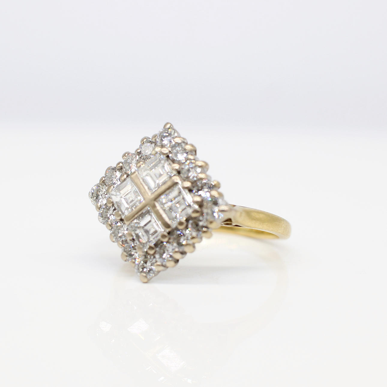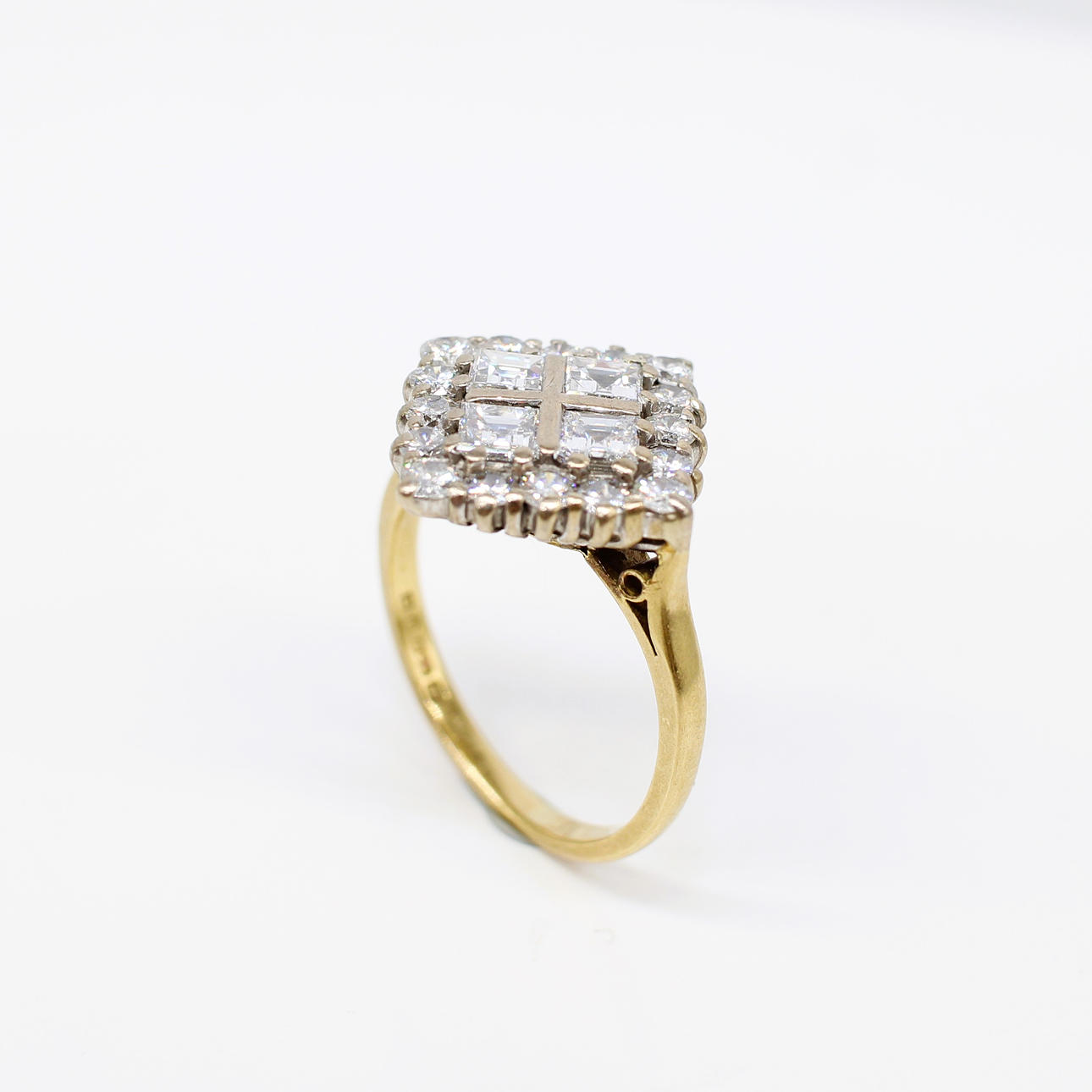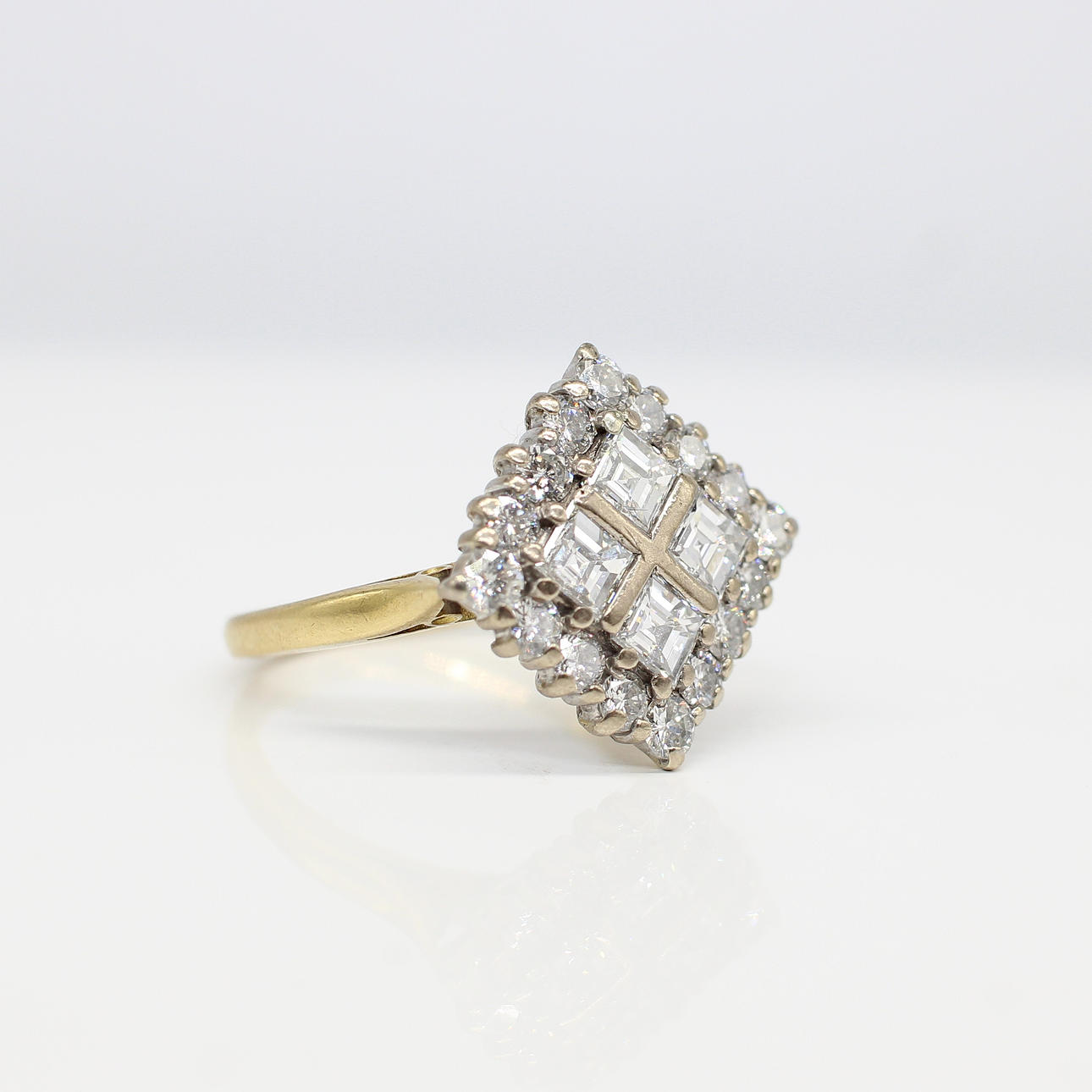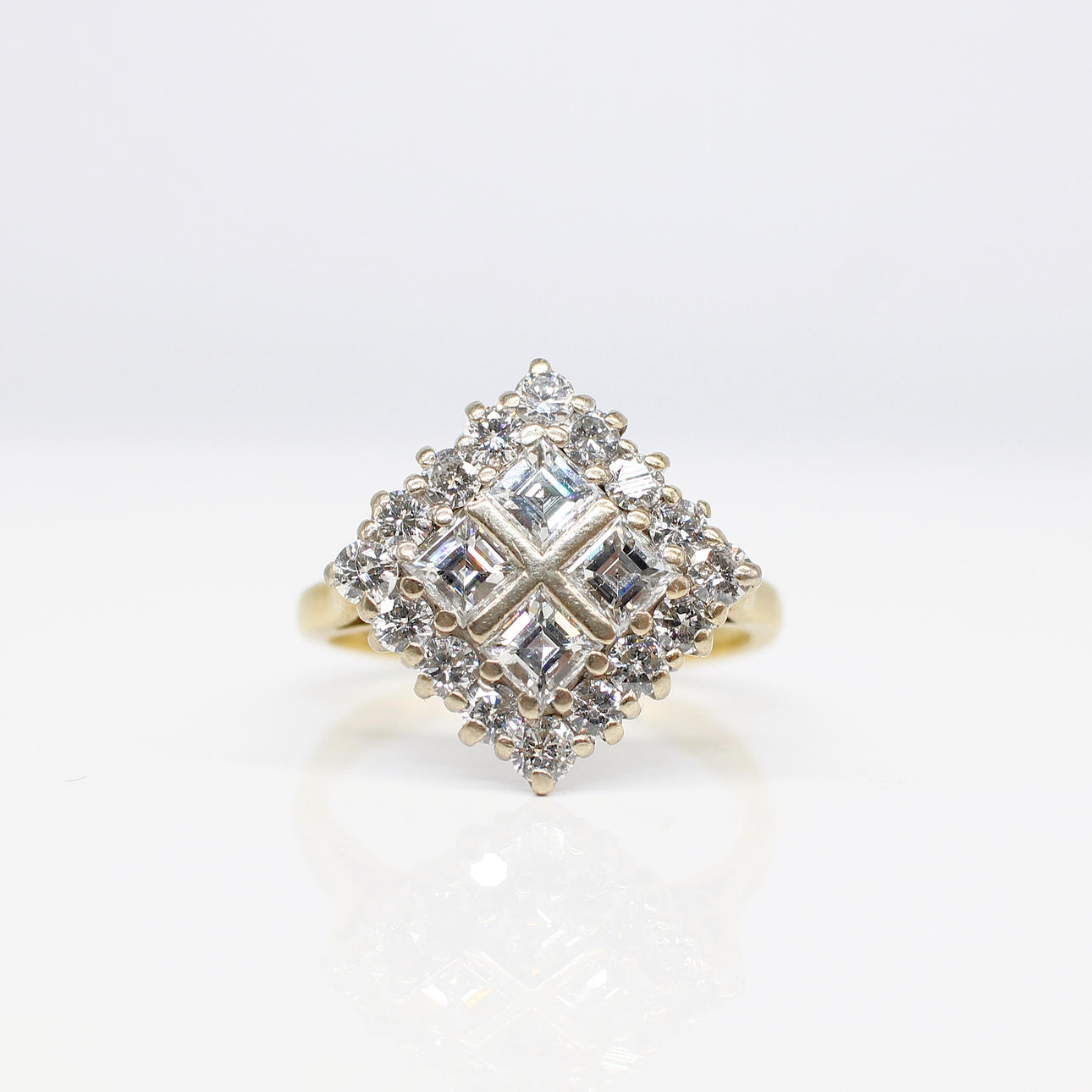 An 18K White And Yellow Gold Square Ring Set With Square Cut And Round Brilliant Cut Diamonds.