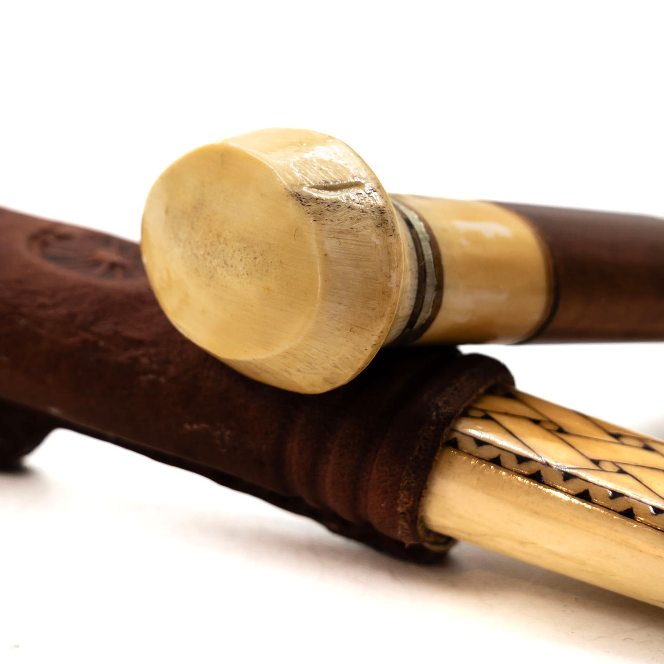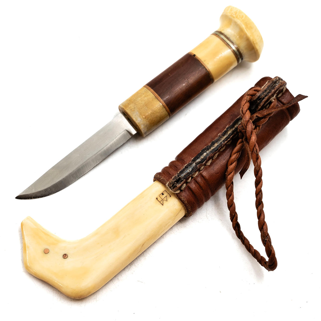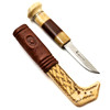 Knife made of engraved reindeer horn, leather and birch. Signed: EB