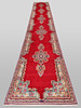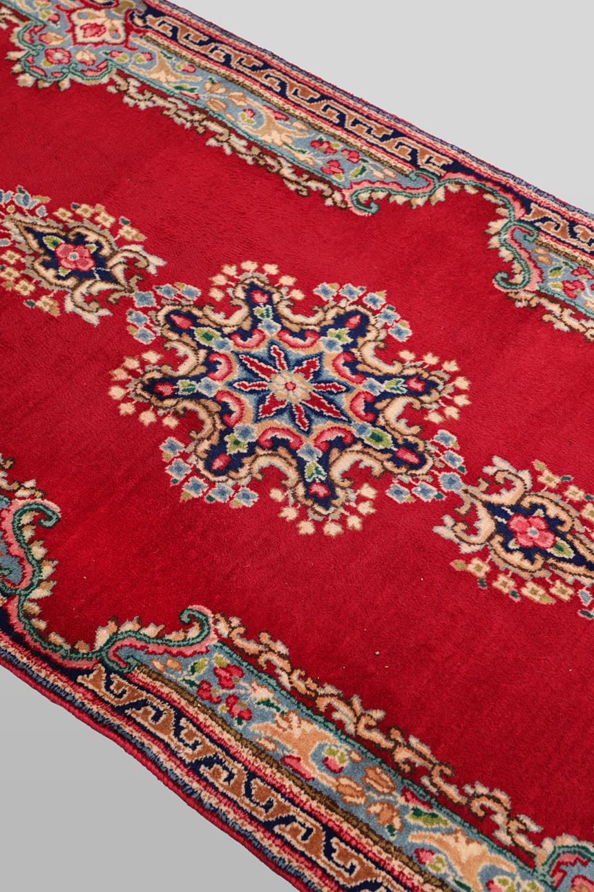 Kirman gallery model with red base color and a row of detailed medallions along the entire length in light blue, beige, green and dark blue. The center field is framed by side partitions with a light blue bottom and floral decor in a similar color scheme, as well as a narrow border with a dark bottom and geometric decor. The forelock is made of wool and the warp is of cotton.