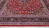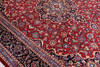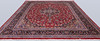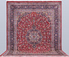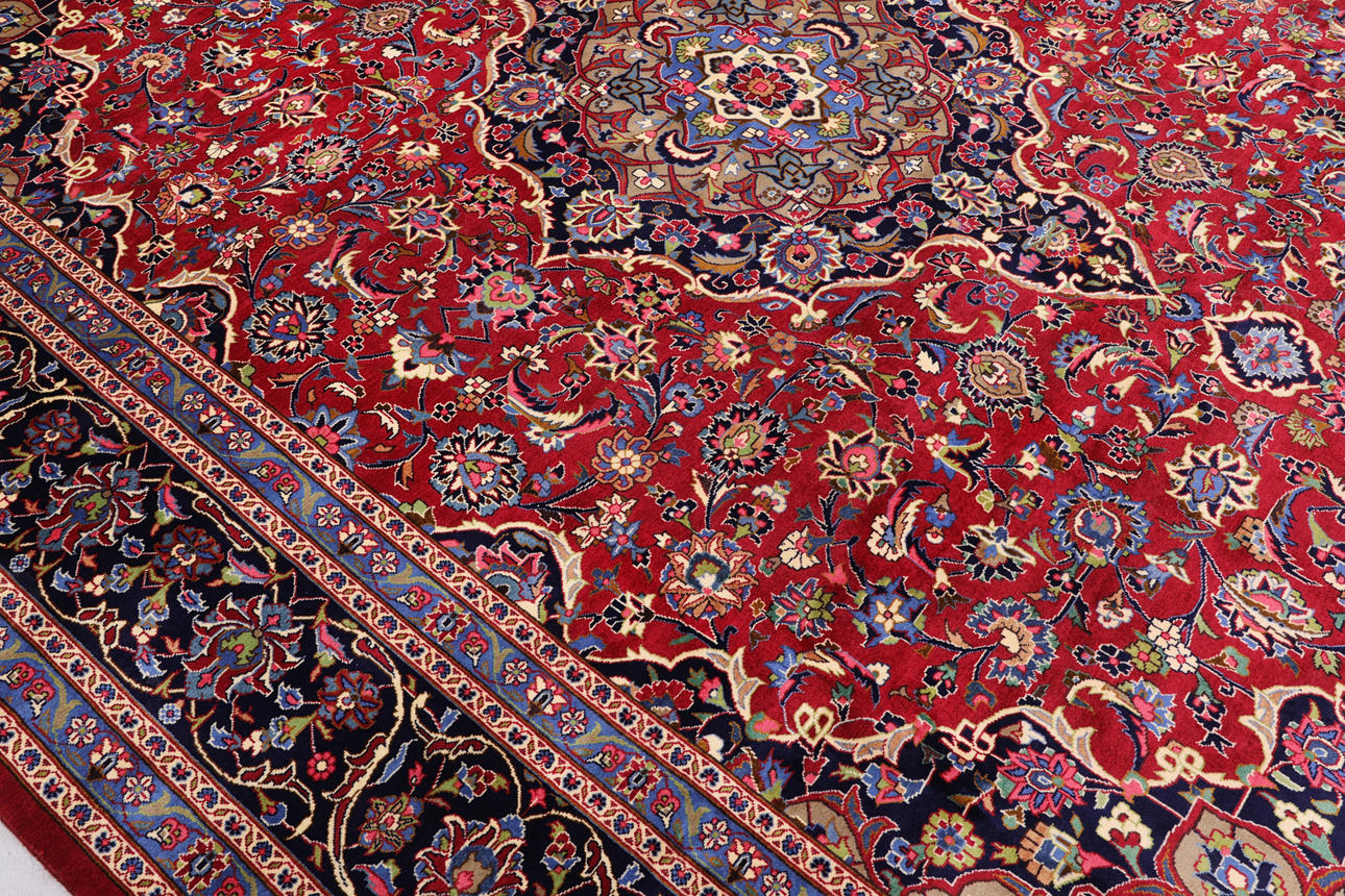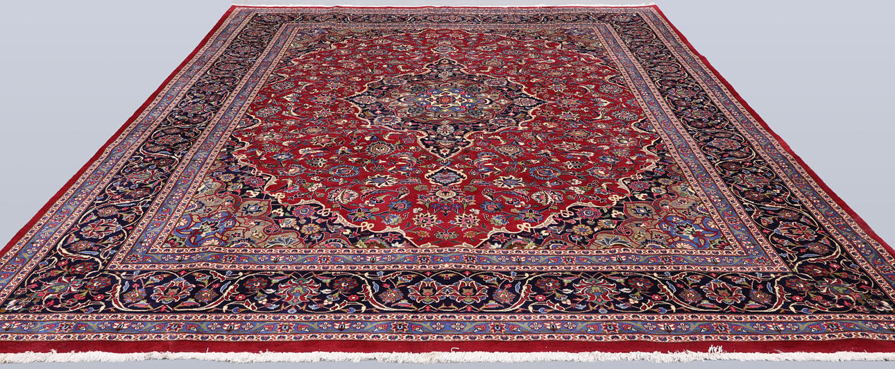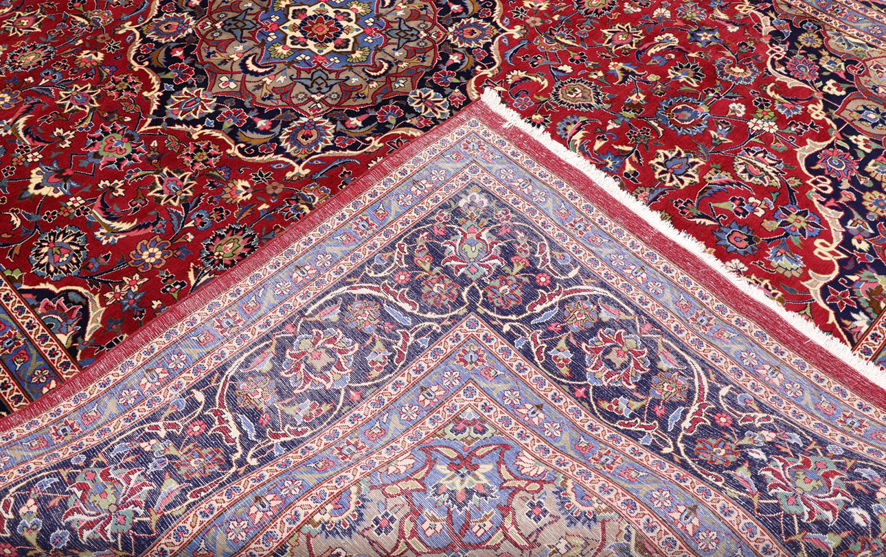 Meshed with red bottom color and a centrally placed medallion with details in blue, beige and pink. The center field is covered in floral ornamentation, palmettes and arabesques in similar shades, and the corner portions follow the same pattern structure and color scheme. The border has a dark blue base and decoration of palmette branches. The forelock is made of wool and the warp is of cotton.
