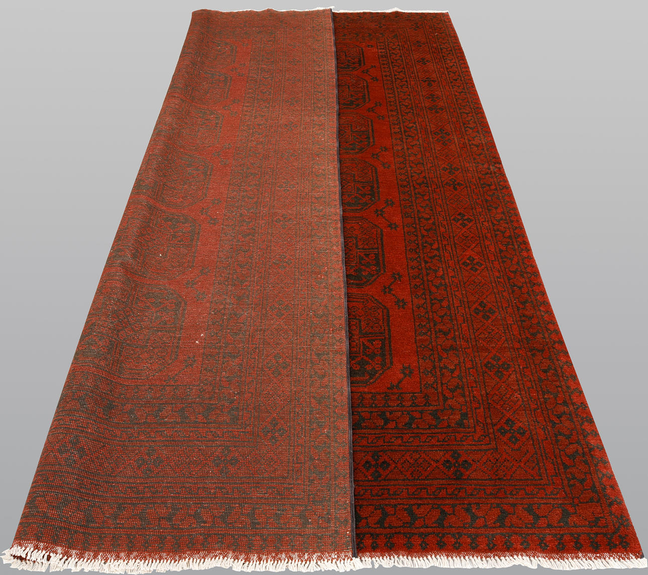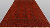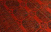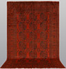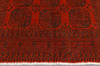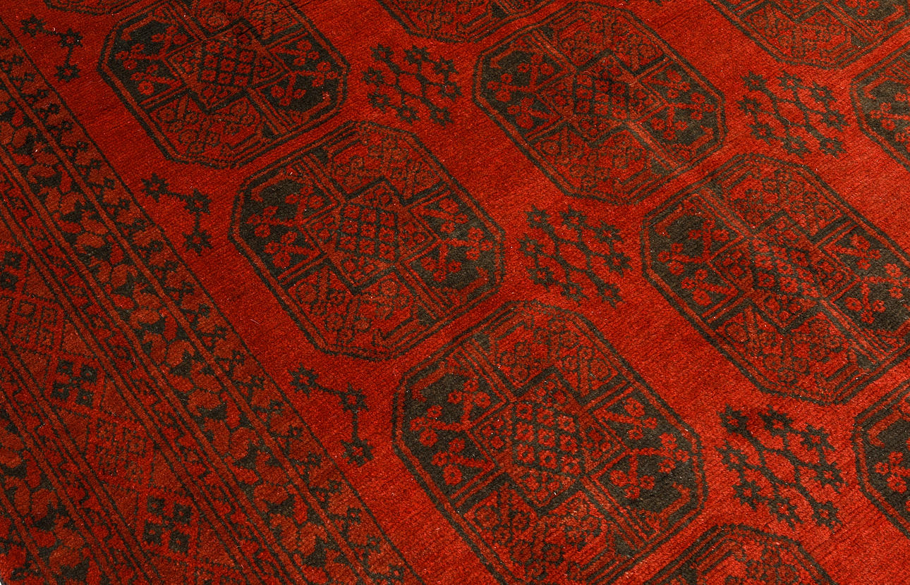 Afghan with a red base color and a center field covered in repeated lake motifs in dark shades. The border consists of repeating geometric patterns in a similar colour scheme. The bangs are made of wool and the warp is made of cotton.