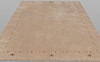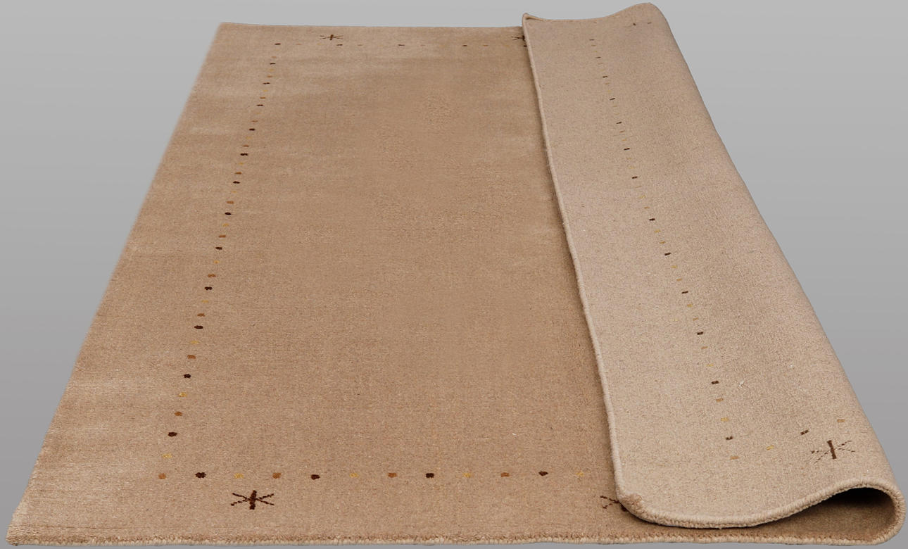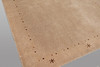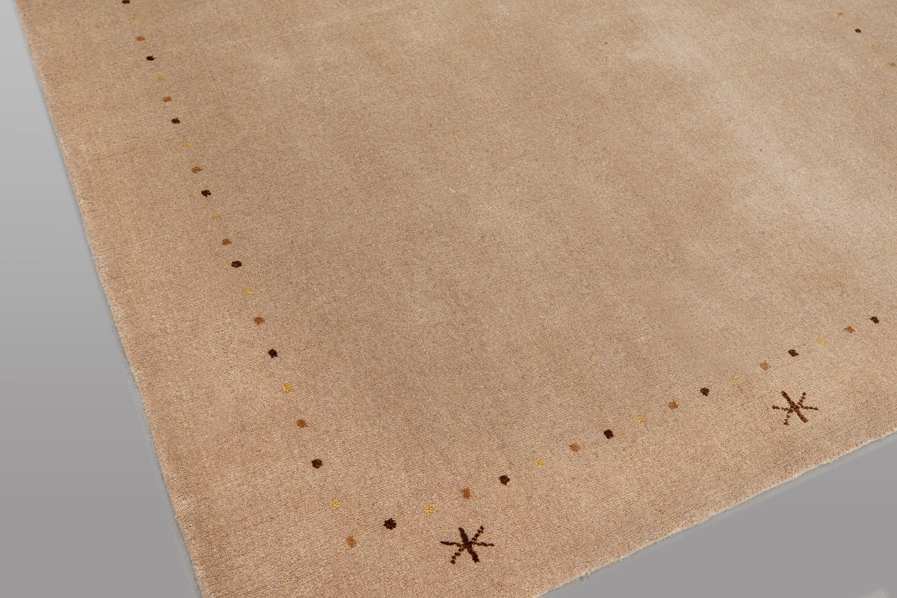 Tibetan rug with beige bottom and sparse decor in the form of small dots along the sides, as well as stylized star motifs in the short sides. The forelock is made of wool and the warp is of cotton.