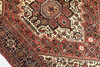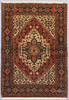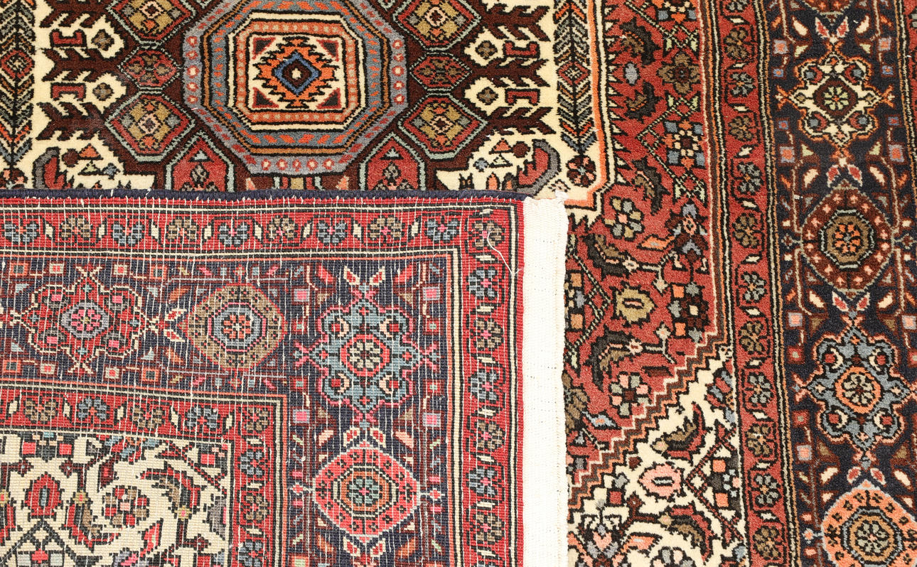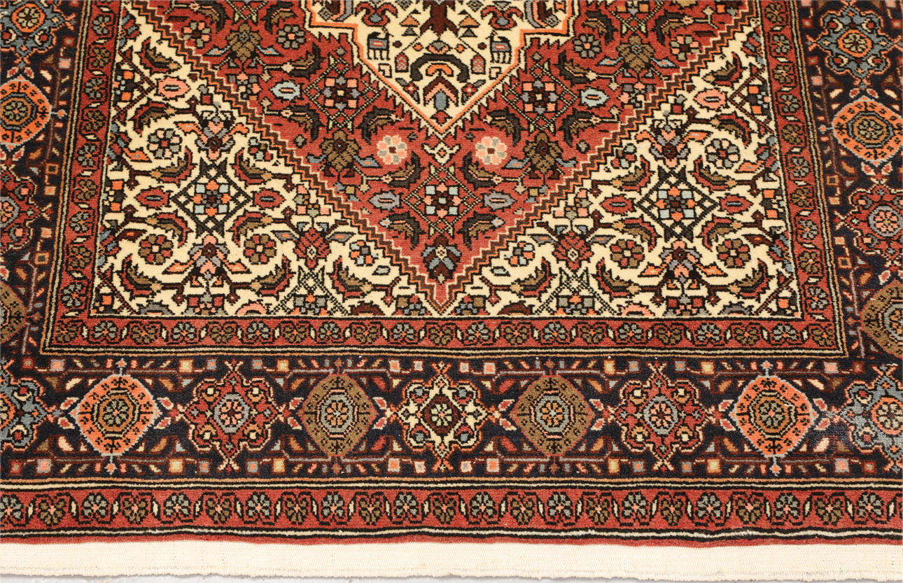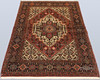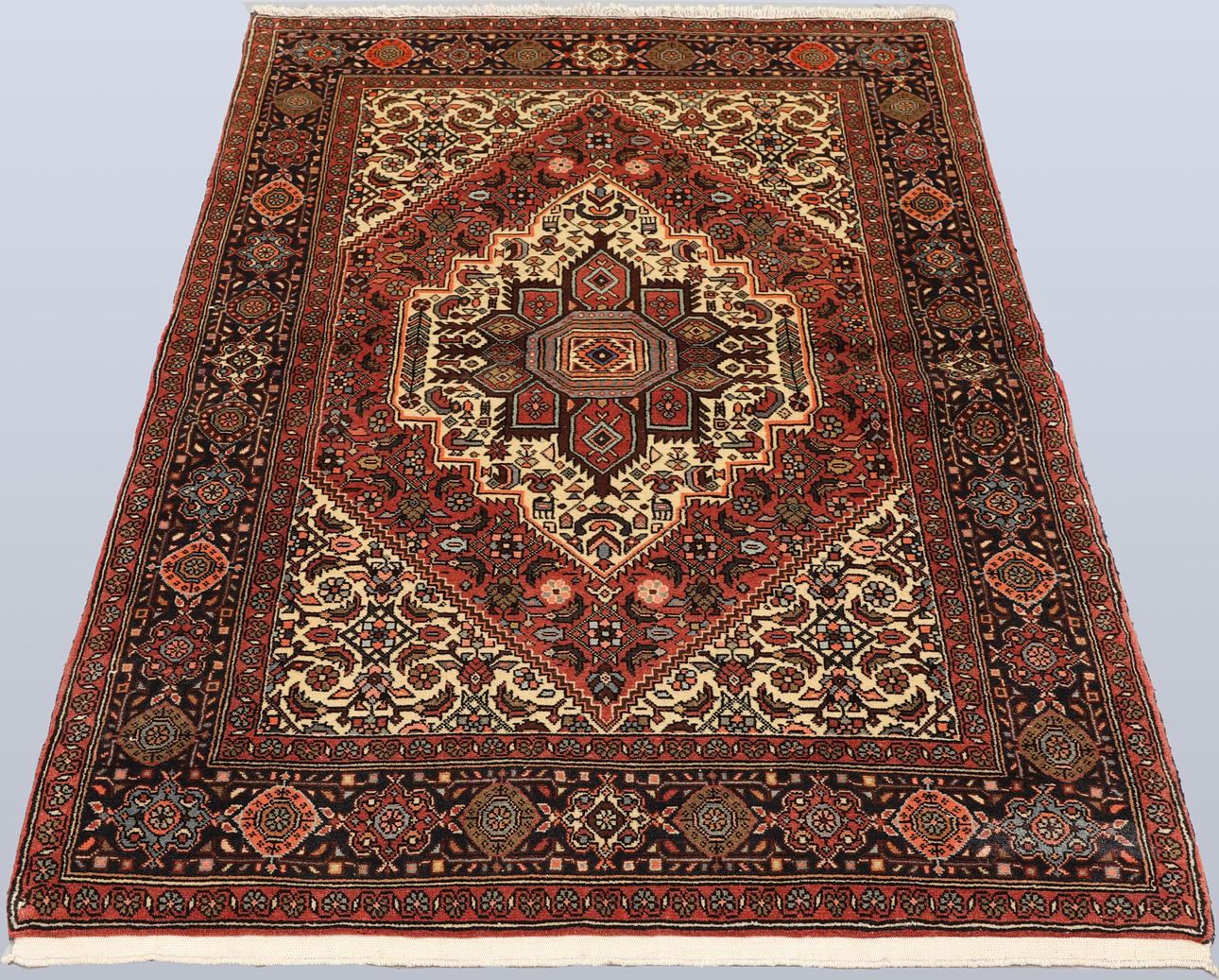 Goltog with a red base and a centrally placed medallion in beige, red and dark blue. The center field is structured with geometric motifs and stylized plant forms, as well as bright corner sections. The border is dark with repeated geometric motifs. The forelock is made of wool and the warp is of cotton.