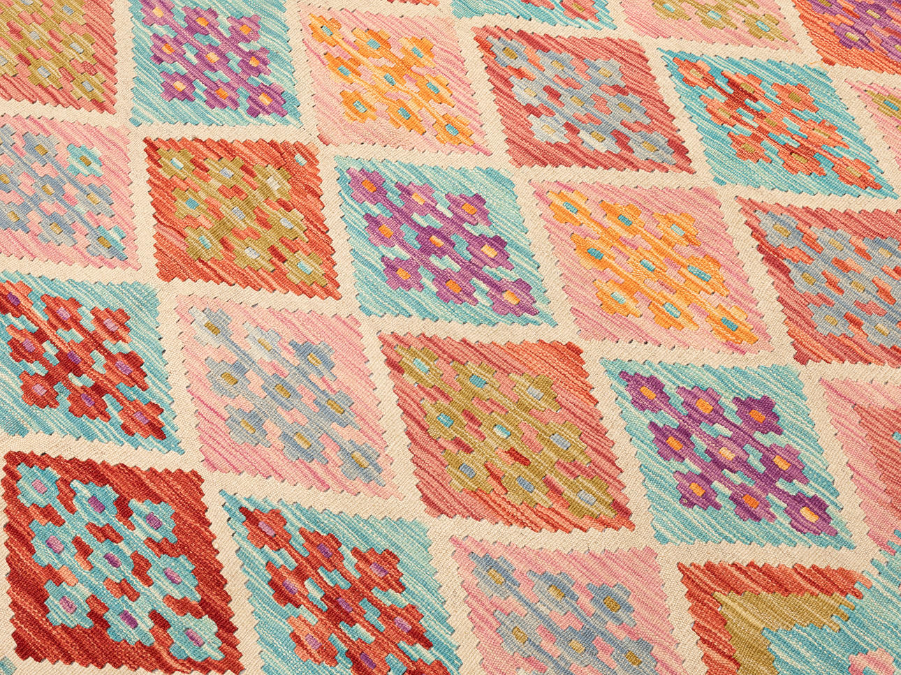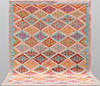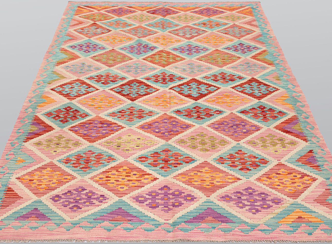 Hand-woven Kelim in classic design with geometric pattern in polychrome color scale.