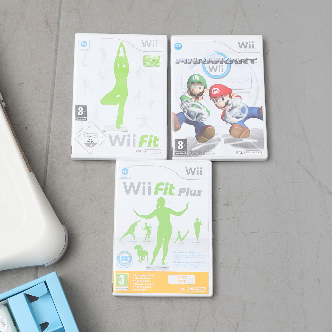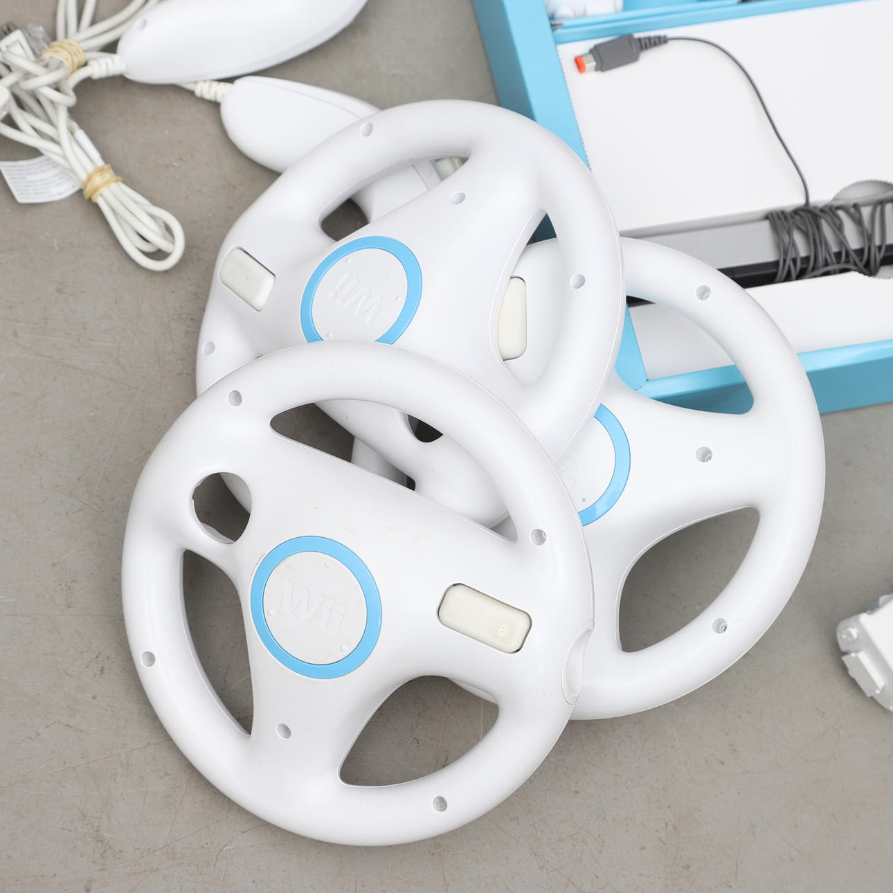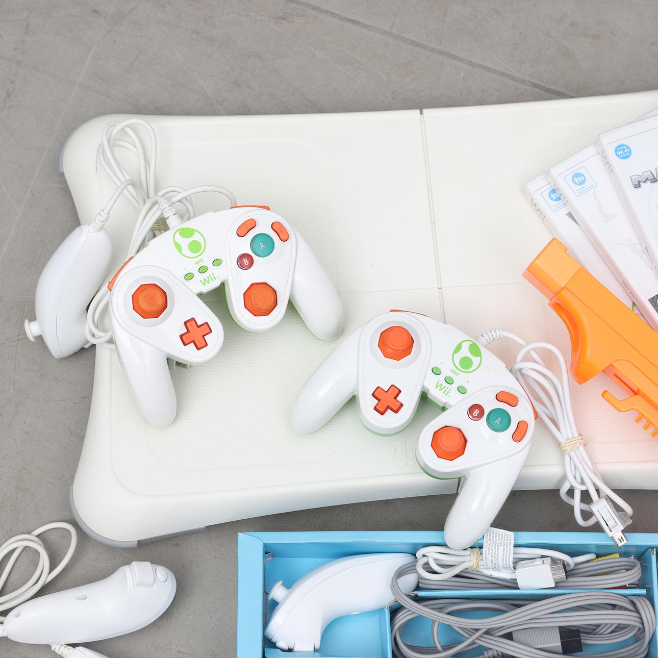 Wii game console, various controllers and accessories, WiFit. 4 games included.